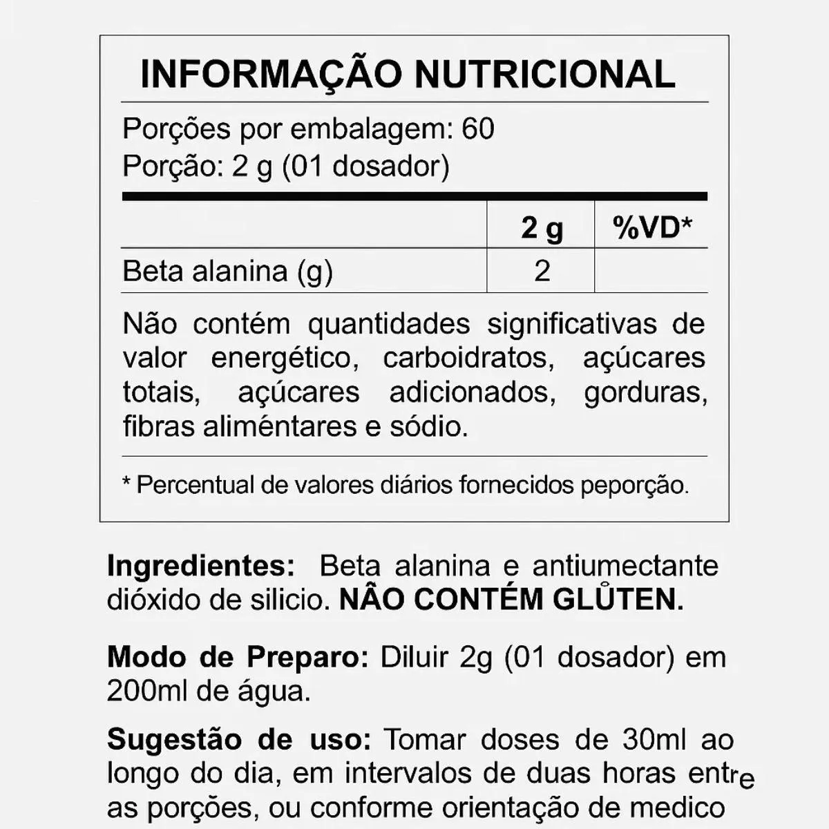 Sua composição beta-alanina obtida por fermentação, sem glúten ou lactose. e não inclui componentes de origem animal ou alergênicos comuns, adaptando-se a diferentes estilos de vida.