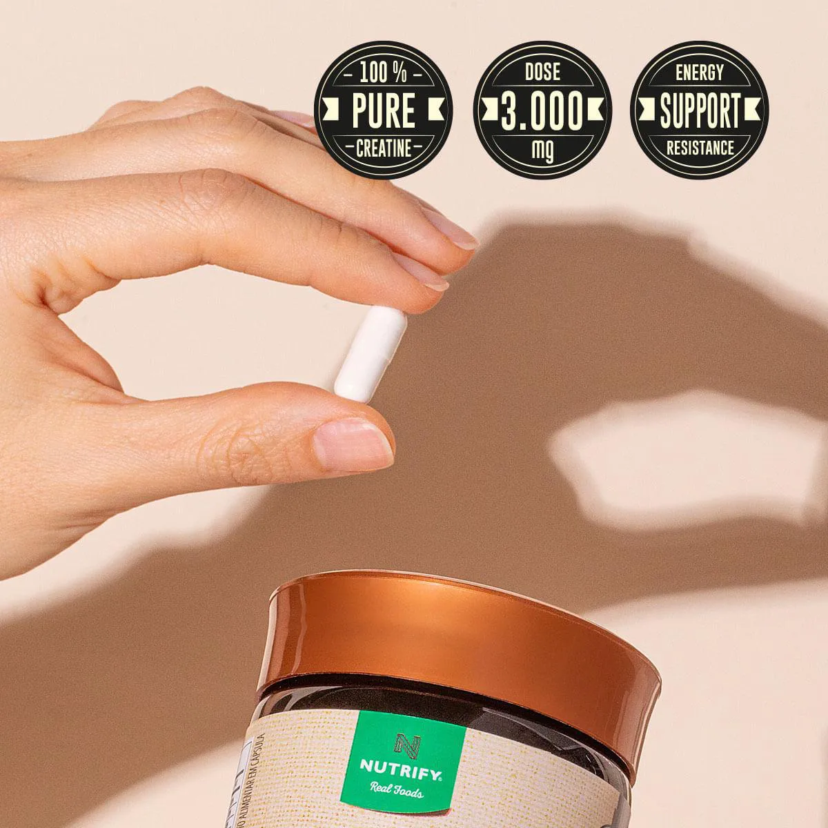 Os benefícios da suplementação de creatina são amplamente comprovados pela ciência. 100% Creatine em cápsulas Nutrify torna o consumo ainda mais prático, fornecendo 3g de creatina por dose. Fabricada com creatina monohidratada, garantindo alto grau de pureza, é livre de corantes, conservantes e aditivos, garantindo uma suplementação eficaz e segura.