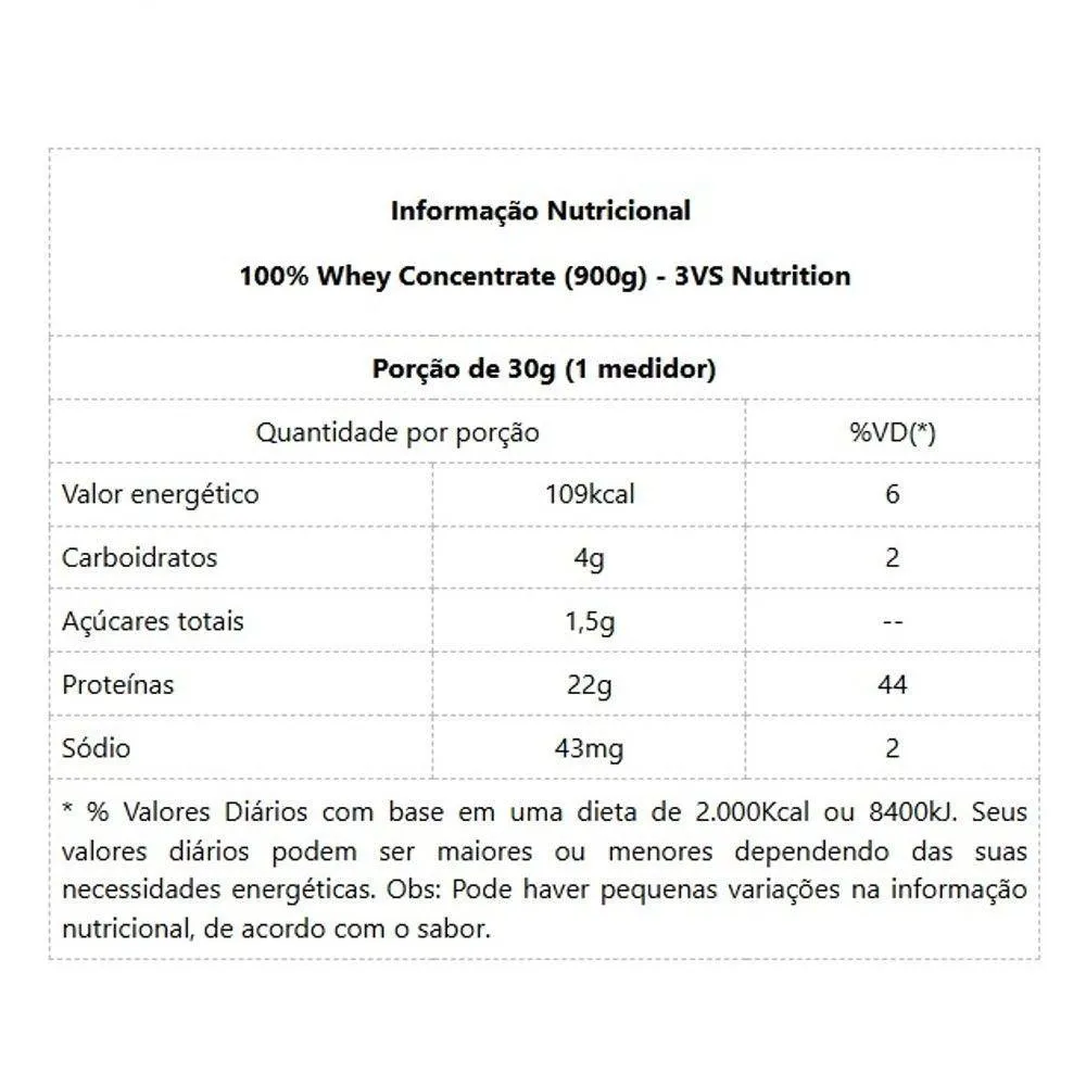 Informação Nutricional 100% Whey Concentrate (900g) - 3VS Nutrition - Sabor NaturalPorção de 30g (1 medidor)Quantidade por porção%VD(*)Valor energético111kcal6Carboidratos3g1Açúcares totais1,2g--Proteínas24g48Sódio44mg2* % Valores Diários com base em uma dieta de 2.000Kcal ou 8400kJ. Seus valores diários podem ser maiores ou menores dependendo das suas necessidades energéticas. Obs: Pode haver pequenas variações na informação nutricional, de acordo com o sabor. Informação Nutricional 100% Whey Concentrate (900g) - 3VS Nutrition - Sabor CookiesPorção de 30g (1 medidor)Quantidade por porção%VD(*)Valor energético109kcal6Carboidratos4g2Açúcares totais1,5g--Proteínas22g44Sódio43mg2* % Valores Diários com base em uma dieta de 2.000Kcal ou 8400kJ. Seus valores diários podem ser maiores ou menores dependendo das suas necessidades energéticas. Obs: Pode haver pequenas variações na informação nutricional, de acordo com o sabor. Informação Nutricional 100% Whey Concentrate (900g) - 3VS Nutrition - Sabor PistachePorção de 30g (1 medidor)Quantidade por porção%VD(*)Valor energético107kcal6Carboidratos3,6g2Açúcares totais1,2g--Proteínas23g48Sódio43mg2* % Valores Diários com base em uma dieta de 2.000Kcal ou 8400kJ. Seus valores diários podem ser maiores ou menores dependendo das suas necessidades energéticas. Obs: Pode haver pequenas variações na informação nutricional, de acordo com o sabor. Informação Nutricional 100% Whey Concentrate (900g) - 3VS Nutrition - Sabor ChocolatePorção de 30g (1 medidor)Quantidade por porção%VD(*)Valor energético106kcal6Carboidratos3,3g2Açúcares totais1,2g--Proteínas22g48Sódio44mg2* % Valores Diários com base em uma dieta de 2.000Kcal ou 8400kJ. Seus valores diários podem ser maiores ou menores dependendo das suas necessidades energéticas. Obs: Pode haver pequenas variações na informação nutricional, de acordo com o sabor. Informação Nutricional 100% Whey Concentrate (900g) - 3VS Nutrition - Sabor BaunilhaPorção de 30g (1 medidor)Quantidade por porção%VD(*)Valor energético109kcal6Carboidratos4,1g2Açúcares totais1,2g--Proteínas23g48Sódio42mg2* % Valores Diários com base em uma dieta de 2.000Kcal ou 8400kJ. Seus valores diários podem ser maiores ou menores dependendo das suas necessidades energéticas. Obs: Pode haver pequenas variações na informação nutricional, de acordo com o sabor. Informação Nutricional 100% Whey Concentrate (900g) - 3VS Nutrition - Sabor MorangoPorção de 30g (1 medidor)Quantidade por porção%VD(*)Valor energético106kcal5Carboidratos3,8g Açúcares totais1,2g--Proteínas22g48Sódio42mg2* % Valores Diários com base em uma dieta de 2.000Kcal ou 8400kJ. Seus valores diários podem ser maiores ou menores dependendo das suas necessidades energéticas. Obs: Pode haver pequenas variações na informação nutricional, de acordo com o sabor.
