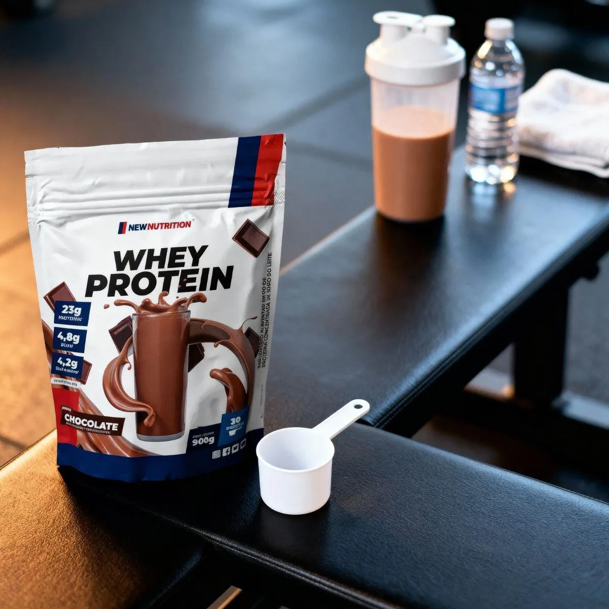 100% whey protein 900g New Nutrition suplemento de proteína de soro 100%, com 900 g de pó para preparo de bebidas ricas em proteínas.
