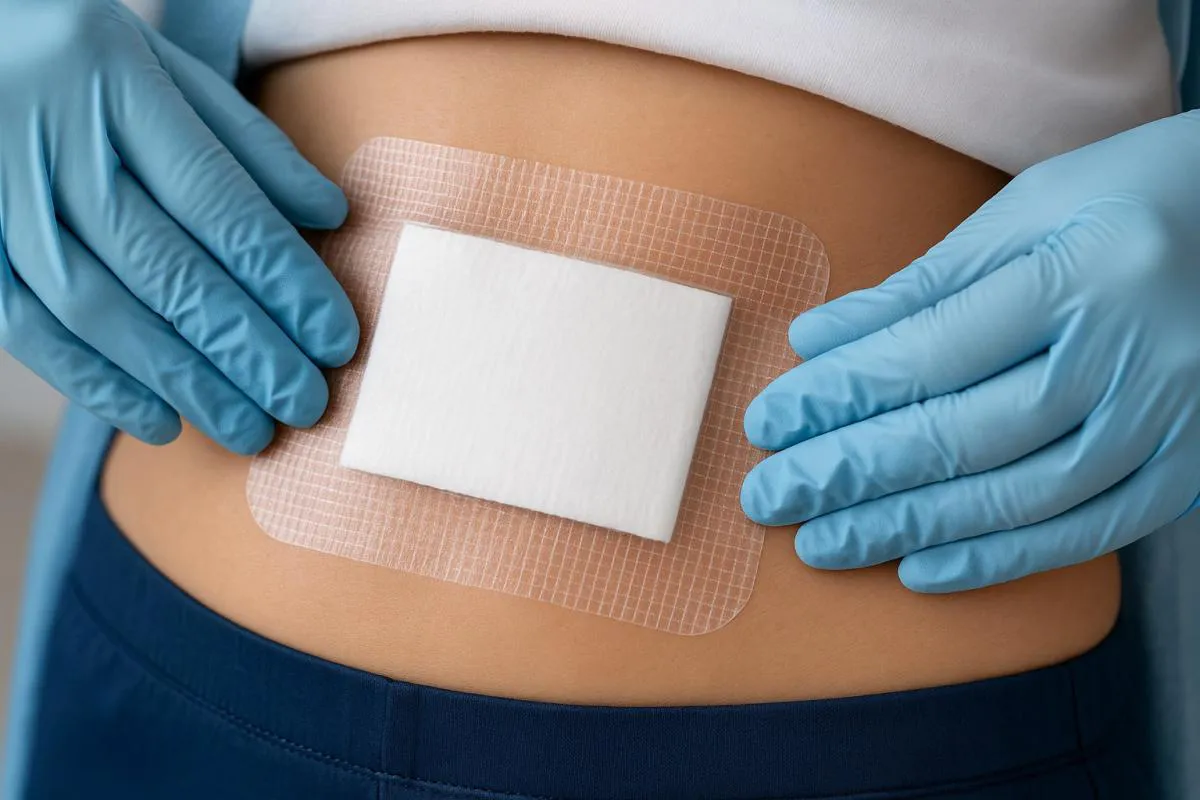 - Remover o protetor número 1 e aplicar a parte central absorvente sobre a ferida.