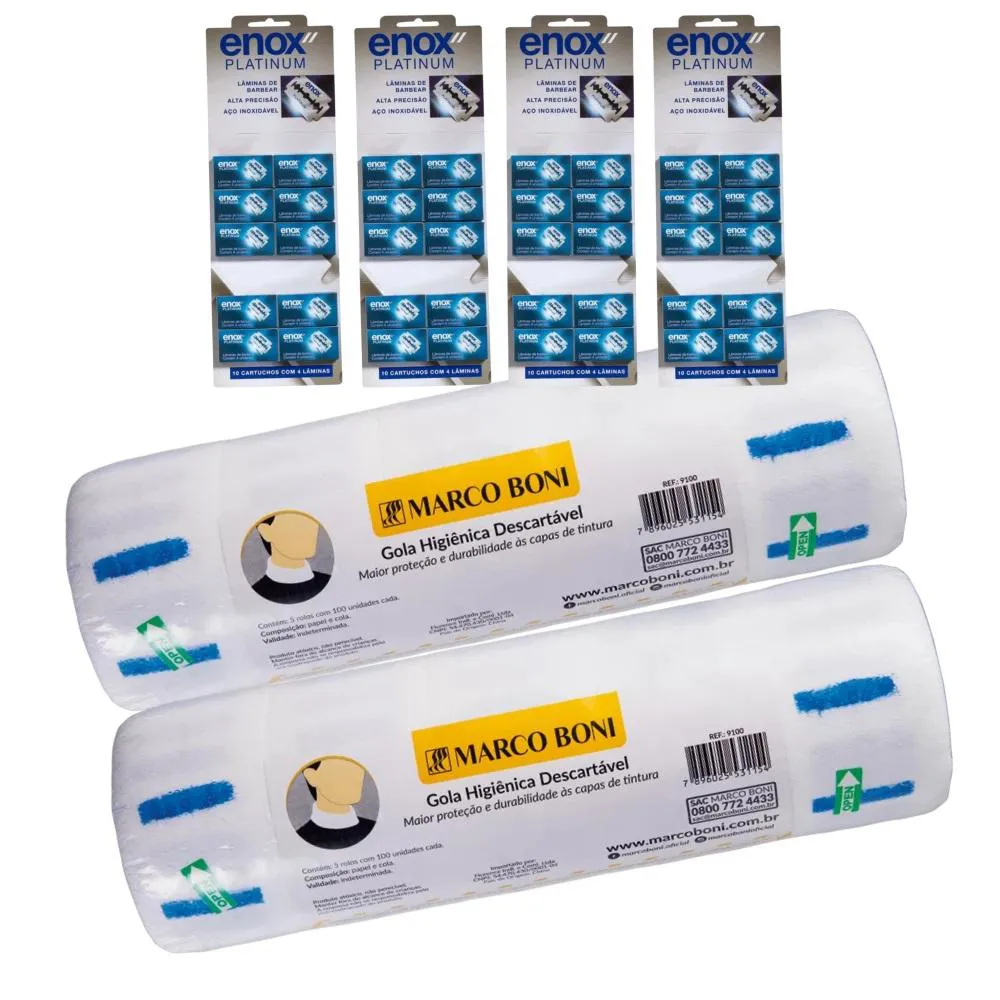 tornando o salão mais profissional e sofisticado. Contém 02 pacote com 5 rolos de gola higiênica descartável Cada rolo contém 100un de gola higiênica LÂMINA DE BARBEAR FIO DUPLO PLATINUM ENOXA Lâmina De Barbear Enox proporciona um corte ágil e preciso. Lâmina duplo fio em aço inoxidável e fio revestido de platina. Indicada para barbear, e finalização em cortes de cabelo. Contém 40 caixas de lâminas de barbear fio duplo platinumCada caixa contém 4 unidades de Laminas de barbear