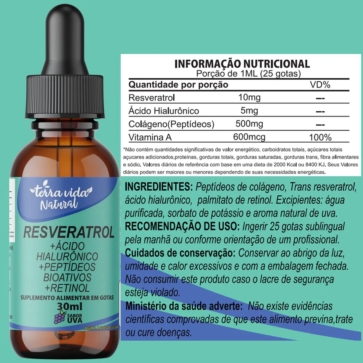 Certamente! A combinação sinérgica de Resveratrol, Ácido Hialurônico, colágeno e vitamina A (Retinol) em um frasco de 30ml, apresentado como um líquido com sabor de uva em forma de gotas sublinguais, oferece uma abordagem integrativa para o cuidado das articulações e da pele.O Resveratrol, conhecido por suas propriedades antioxidantes e anti-inflamatórias, ajuda a proteger as articulações e a pele contra danos oxidativos e inflamações nocivas. O Ácido Hialurônico, por sua vez, promove a hidratação profunda, melhorando a elasticidade e a flexibilidade da pele e das articulações.O Colágeno, fundamental para a estrutura dos tecidos conectivos, fortalece as articulações, contribuindo para a mobilidade e a resistência. Enquanto isso, a Vitamina A (Retinol) estimula a renovação celular, ajudando na reparação dos tecidos e na melhoria da textura e aparência da pele.Essa formulação líquida e de absorção sublingual proporciona uma entrega eficiente dos nutrientes, maximizando sua biodisponibilidade e garantindo benefícios rápidos e visíveis. Ideal para indivíduos que buscam um suporte abrangente para o bem-estar das articulações e a vitalidade da pele, de maneira conveniente e eficaz.
