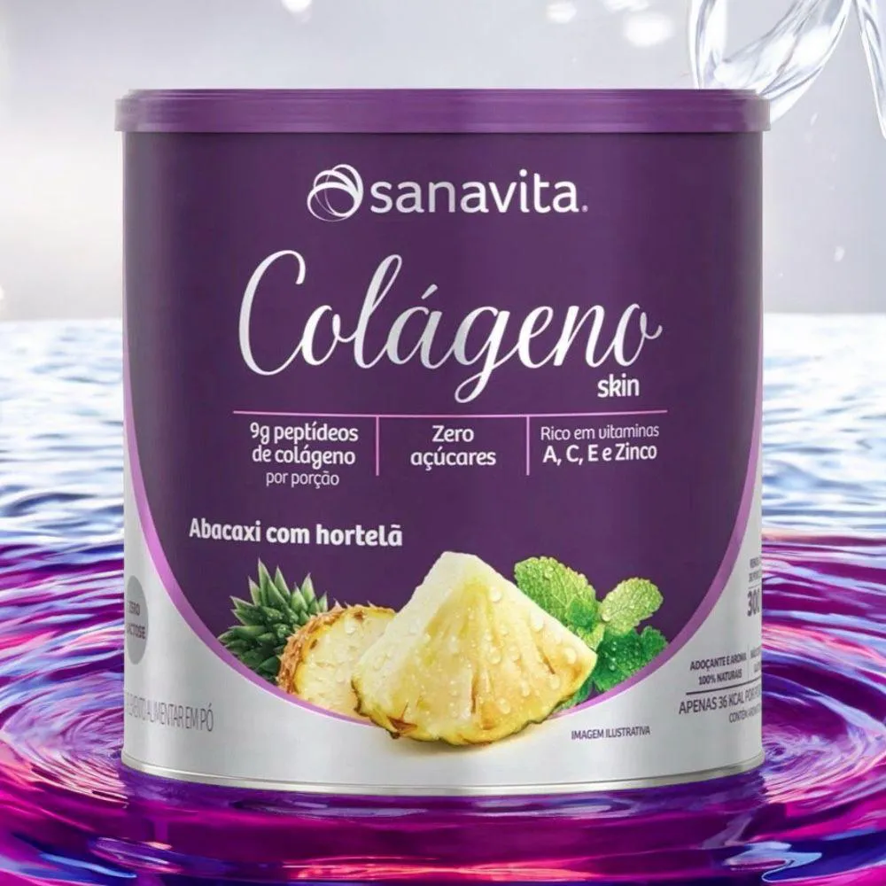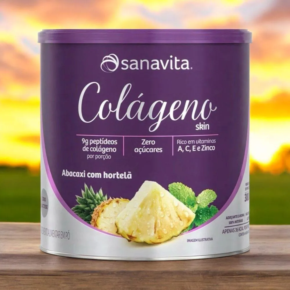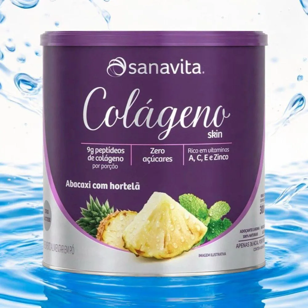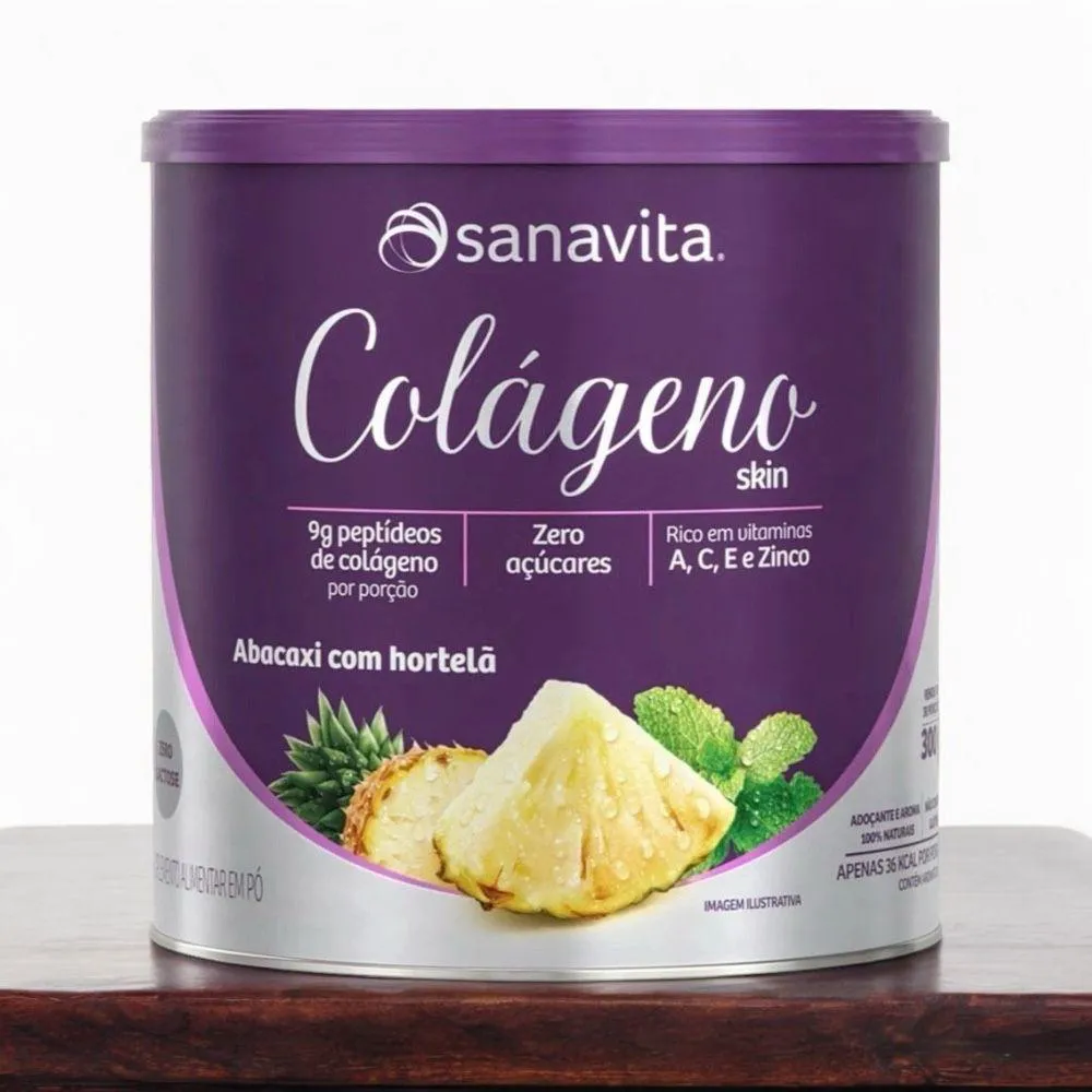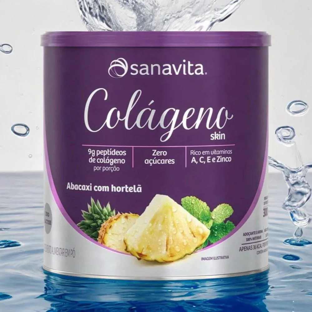 O colágeno Hidrolisado Sanavita 300g sabor Abacaxi com Hortelã é um suplemento que combina 9g de peptídeos ativos de colágeno de alta absorção com um complexo antioxidante que inclui as vitaminas A, C, E e o mineral zinco, que atendem 100% das necessidades diárias. Ele promove a saúde e beleza da pele, protegendo-a dos danos causados por radicais livres e auxiliando na produção natural de colágeno, além de ser benéfico para cabelo e unhas.