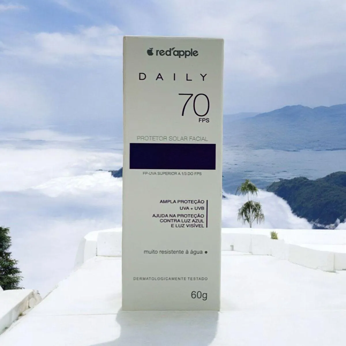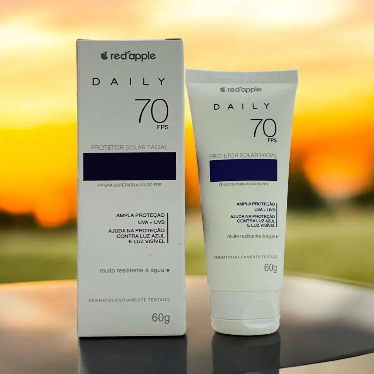 O Red Apple FPS 70 Facial 60g é um protetor solar de alta proteção que aumenta em 70 vezes a resistência natural da pele ao sol. Sua fórmula oferece ampla proteção contra raios UVA e UVB, além de proteger contra a luz visível e azul, prevenindo o envelhecimento precoce da pele, rugas e sinais provocados pelo sol e iluminação artificial. Possui textura leve, é livre de parabenos, e foi desenvolvido para pele normal e seca, proporcionando hidratação intensiva com o benefício do extrato de germe de trigo. O produto é muito resistente à água, mantendo sua eficácia por até 80 minutos dentro d’água, e é dermatologicamente testado.