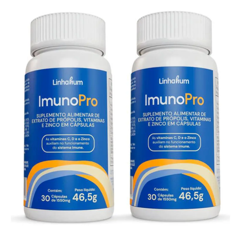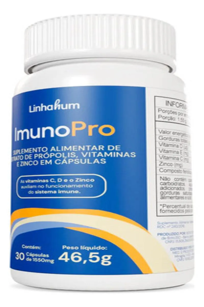 ImunoPRO da LinhaHum é um suplemento alimentar em cápsula composto por extrato de própolis verde, vitaminas C, D, E e Zinco, nutrientes que auxiliam no reforço imunológico, além de possuírem ação antioxidante e anti-inflamatória.