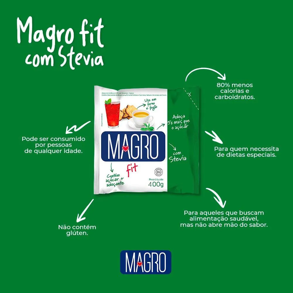 O Magro Fit com Stévia 400g é a perfeita combinação do sabor do açúcar com as calorias do adoçante. Ideal para quem busca uma alimentação mais saudável, mas não abre mão do sabor.
