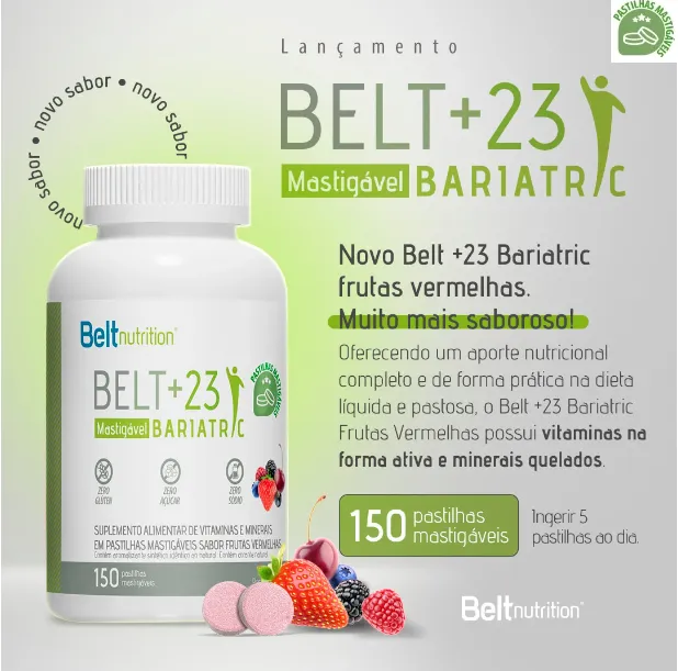 BELT +23 BARIATRIC MASTIGÁVEL - SABOR FRUTAS VERMELHAS. Kit contendo 2 frascos com 150 pastilhas cada.