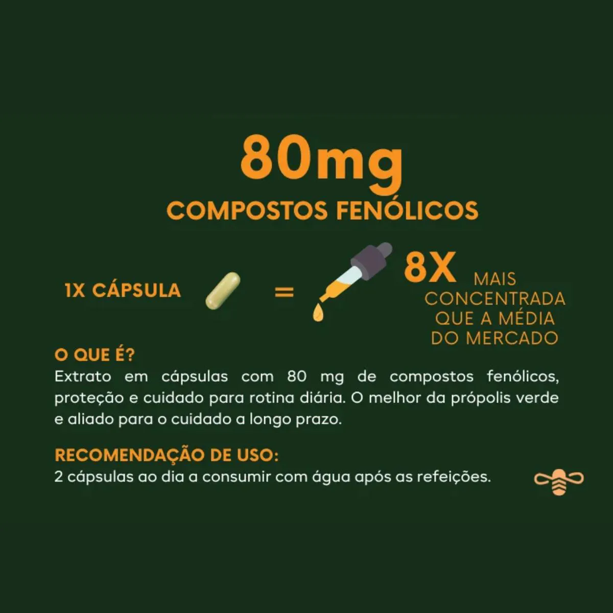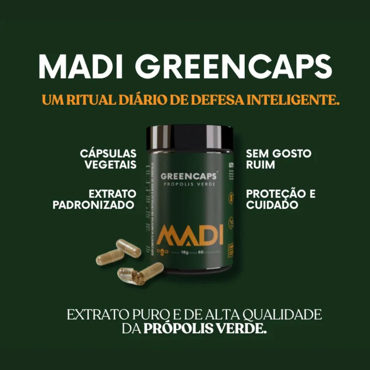 Própolis verde puro em cápsulas práticas, potentes e sem gosto amargo. O GREENCAPS da MAD é a própolis verde da mais alta qualidade do Brasil, agora em cápsulas puras e concentradas, sem aditivos. É a forma mais prática, simples e eficaz de consumir a própolis verde no dia a dia. Usamos somente o extrato padronizado com alta concentração de artepellin-C, direto do sul de Minas, com rastreabilidade completa e sem qualquer açúcar, álcool ou contaminantes. Enquanto outras própolis vêm diluídos ou misturados com mel, o nosso é puro, direto ao ponto.Você sente a diferença. E sua saúde também. Ingredientes: Extrato de Própolis de Baccharis dracunculifolia - alecrim silvestre. Sugestão de uso: Tomar 2 cápsulas diariamente com água, conforme sugestão de um profissional.