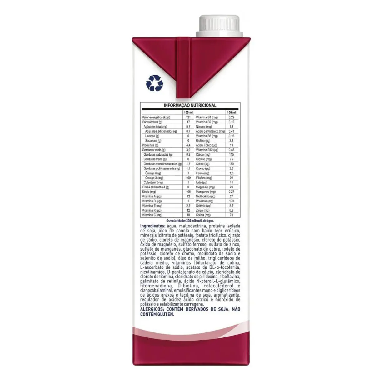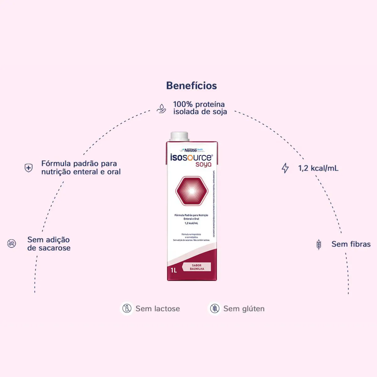 Isosource® Soya é uma fórmula padrão para nutrição enteral e oral, com 100% proteína de soja e 1,2 kcal por ml. Ideal para dietas específicas. Ingredientes: Água, maltodextrina, proteína isolada de soja, óleo de canola, triglicerídeos de cadeia média, minerais ( citrato de potássio, fosfato tricálcico, citrato de sódio, cloreto de potássio, óxido de magnésio, cloreto de magnésio, sulfato ferroso, sulfato de zinco, sulfato de manganês, gluconato de cobre, iodeto de potássio, cloreto de cromo, molibdato de sódio, selenito de sódio), vitaminas (bitartarato de colina, L- ascorbato de sódio, acetato de DL-?-tocoferila, nicotinamida, D- pantotenato de cálcio, cloridrato de cloreto de tiamina, cloridrato de piridoxina, riboflavina, palmitato de retinila, ácido N- pteroil-L-glutâmico, fitomenadiona, D- biotina, colecalciferol, cianocobalamina), antiespumante mono e diglicerídeos de ácidos graxos e polidimetilsiloxano, emulsificante lecitina de soja, aromatizante, estabilizante carragena, corante natural urucum.