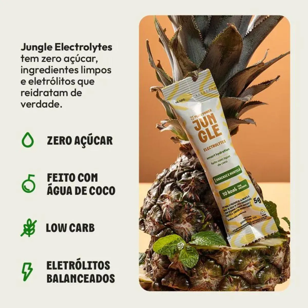 O Jungle Electrolytes Abacaxi e Hortelã é um suplemento de eletrólitos em pó, desenvolvido para quem busca uma hidratação prática, leve e eficiente. Com um sabor refrescante e equilibrado de Abacaxi e Hortelã, essa bebida funcional entrega os principais minerais que o corpo precisa para manter o ritmo e o bem-estar. Cada porção de 5g (diluída em 300ml de água) possui apenas 10 calorias. A fórmula é vegana e limpa — sem açúcar, sem conservantes, sem corantes e livre de aditivos sintéticos. Uma solução inteligente para repor eletrólitos, fortalecer a imunidade, auxiliar na recuperação muscular e trazer mais equilíbrio à sua rotina. Ingredientes: Abacaxi em pó, sais de magnésio do ácido cítrico (magnésio), água de coco orgânica em pó, ácido ascórbico (vitamina c), cloreto de sódio (sal), hortelã em pó, regulador de acidez citrato de sódio e ácido cítrico, aromas naturais, estabilizante citrato de potássio, antiumectante fosfato tricálcico e edulcorante glicosídeos de steviol produzido enzima camente. NÃO CONTÉM GLÚTEN. Basta diluir uma porção em 300 mL de água para uma bebida refrescante, funcional e pronta para acompanhar sua rotina — no treino, no trabalho ou onde você estiver.