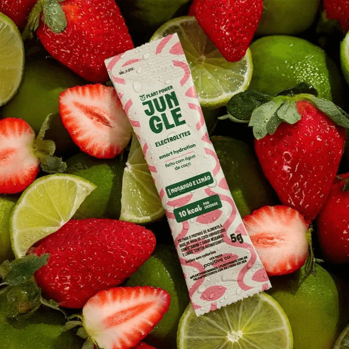 O Jungle Electrolytes Morango e Limão é um repositor eletrolítico em pó, desenvolvido para oferecer praticidade e suporte na hidratação diária. Com apenas 10 calorias por porção, é ideal para quem busca uma hidratação com equilíbrio, leveza e conveniência. Sua fórmula combina ingredientes naturais como água de coco orgânica em pó, sais minerais e vitamina c, contribuindo para o funcionamento do sistema imune e o desempenho físico no dia a dia. Livre de conservantes, corantes e aditivos sintéticos, o Jungle Stick é zero açúcar adicionado e adoçado naturalmente com stévia. Ingredientes: Água de coco orgânica em pó, sais de magnésio do ácido cítrico (magnésio), morango em pó, limão em pó, ácido ascórbico (vitamina C), cloreto de sódio (sal), regulador de acidez citrato de sódio e ácido cítrico, aromas naturais, estabilizante citrato de potássio, antiumectante fosfato tricálcico e edulcorante glicosídeo de steviol produzido enzimaticamente. Basta diluir uma porção em 300 mL de água para uma bebida refrescante, funcional e pronta para acompanhar sua rotina — no treino, no trabalho ou onde você estiver.