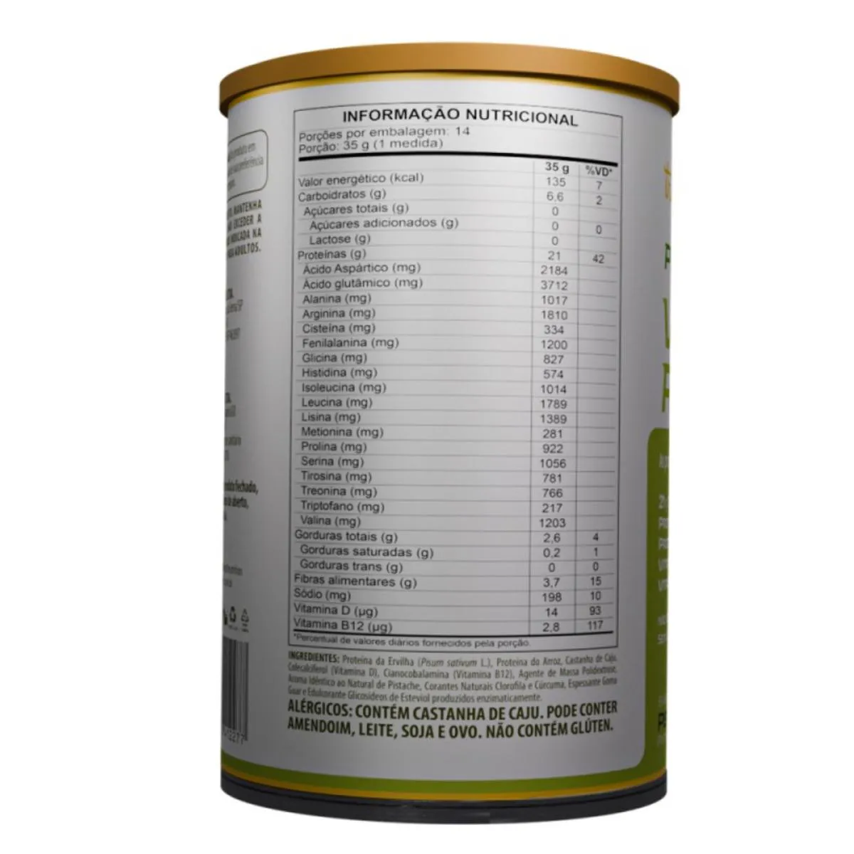 Desfrute de uma combinação deliciosa e cremosa da proteína da ervilha e do arroz, que oferece um excelente perfil de aminoácidos para o seu corpo. Essa mistura também é rica em gorduras saudáveis, que contribuem para o fortalecimento do intestino. Aproveite o sabor irresistível de Pistache, enquanto nutre o seu corpo de maneira completa e saborosa. Ingredientes: Proteína do Arroz, Proteína da Ervilha, Cacau em Pó, fibras Alimentares, Farinha de Avelã, vitamina d (Colecalciferol), vitamina B12 (Cianocobalamina), Espessantes Goma Guar e Goma Xantana, Aroma Idêntico ao Natural de Pistache, Edulcorante Glicosídeos de Esteviol.ZERO GLÚTEN/LACTOSE Sugestão de uso: Dissolver 35g (1 medida) do produto em 200ml de água ou bebida de sua preferência e consumir logo após o preparo. Não exceder a recomendação diária de consumo indicada na embalagem.