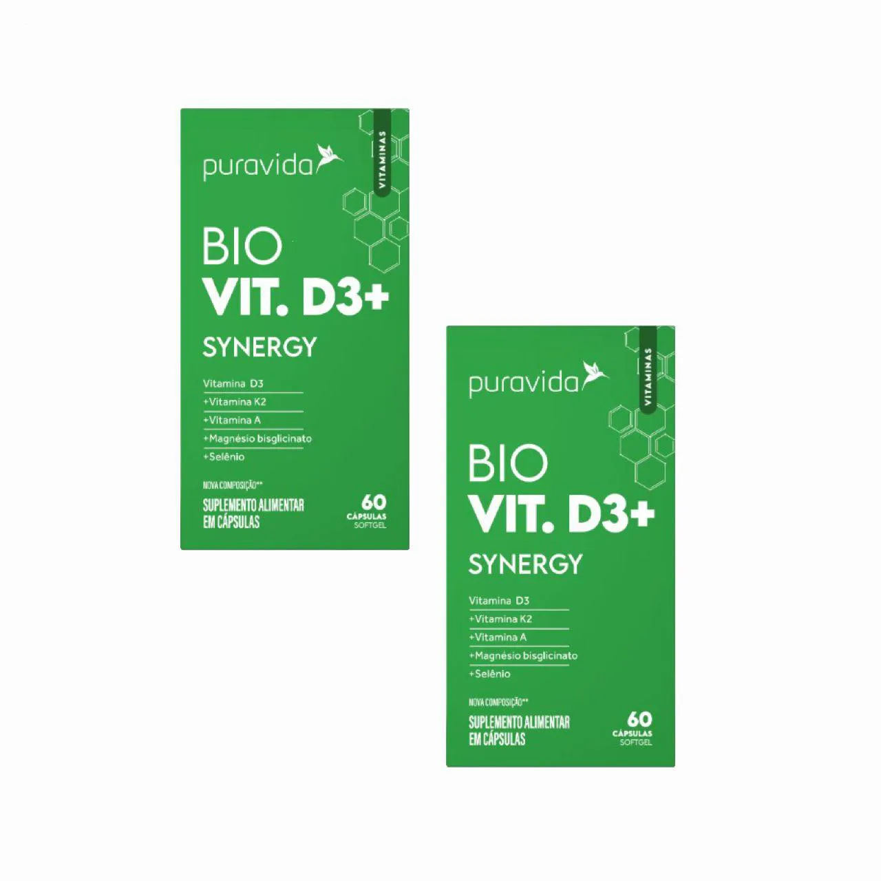 Os Synergy D3 são suplementos nutricionais em cápsulas, compostos por uma fórmula que contém vitamina D3, Vitamina A, Vitamina K2, Magnésio e Selênio, acondicionados em um kit com 2 frascos de 60 cápsulas cada.
