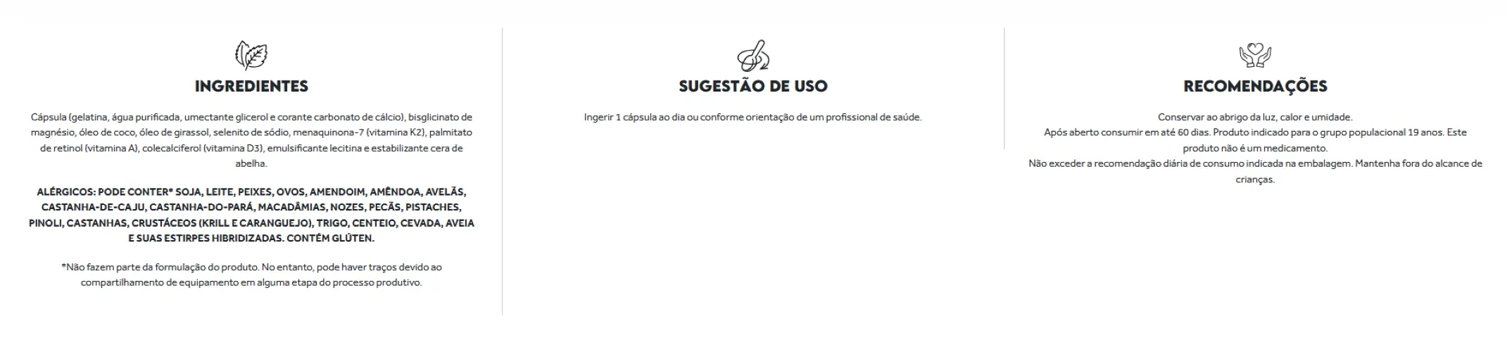 - Fórmula com vitaminas A, K2 e magnésio.