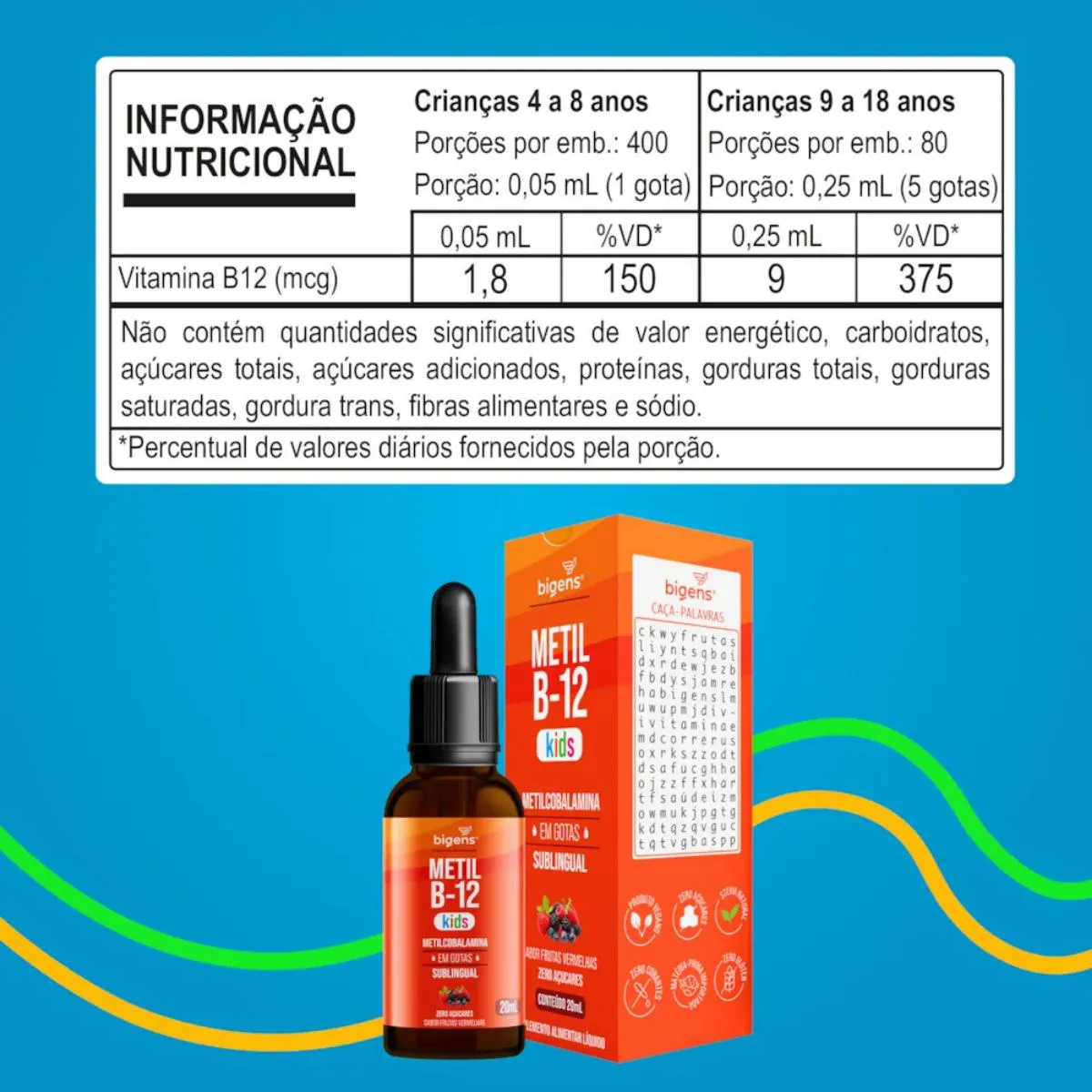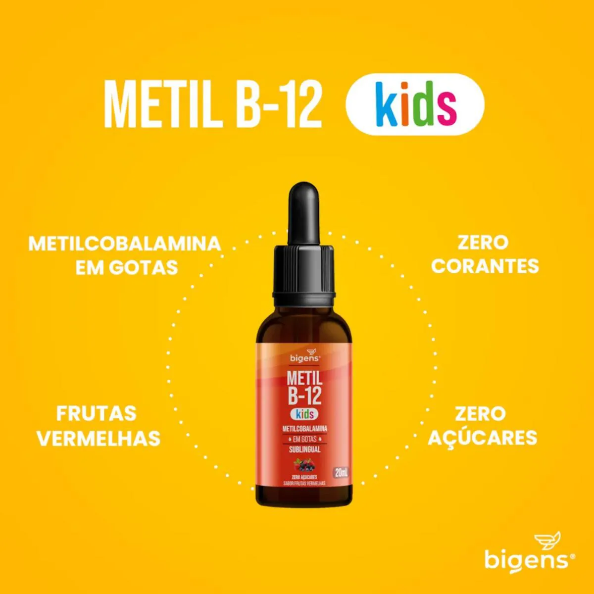 O METIL B-12 KIDS da Bigens é um suplemento especialmente formulado para crianças, proporcionando Metilcobalamina (vitamina B12) em um formato sublingual de fácil administração. Com um delicioso sabor de frutas vermelhas, este produto é uma opção saudável e nutritiva para os pequenos. Este suplemento é em gotas, zero açúcares, vegano, zero corantes, adoçado com Stevia natural e zero glúten, garantindo uma escolha segura e adequada para crianças com diversas necessidades alimentares. A dosagem recomendada para crianças de 4 a 8 anos é de 1 gota, que fornece 1,8 mcg de Metil B12, enquanto para crianças de 9 a 18 anos, recomenda-se ingerir 5 gotas, que fornecem 9 mcg de Metil B12. O METIL B-12 KIDS da Bigens é uma escolha confiável e de alta qualidade para complementar a nutrição das crianças, oferecendo todos os benefícios da Metilcobalamina de forma prática e saborosa. Ingredientes: Água purificada, glicerina bi-destilada, metilcobalamina (vitamina B12), acidulante ácido cítrico, aromatizantes idênticos aos naturais, corante vermelho beterraba, conservantes sorbato de potássio. NÃO CONTÉM GLÚTEN. Sugestão de uso: Crianças entre 4 e 8 anos: ingerir 1 gota, 1 vez ao dia. Crianças entre 9 e 18 anos: ingerir 5 gotas, 1 vez ao dia