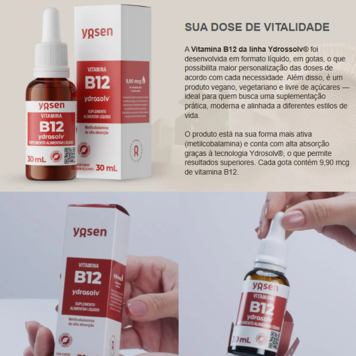 A vitamina B12 da linha Ydrossolv® foi desenvolvida em formato líquido, em gotas, o que possibilita maior personalização das doses de acordo com cada necessidade. Além disso, é um produto vegano, vegetariano e livre de açúcares — ideal para quem busca uma suplementação prática, moderna e alinhada a diferentes estilos de vida. O produto está na sua forma mais ativa (metilcobalamina) e conta com alta absorção graças à tecnologia Ydrosolv®, o que permite resultados superiores. Cada gota contém 9,90 mcg de vitamina B12. A Vitamina B12 é uma vitamina hidrossolúvel, com papel essencial para o metabolismo humano, capaz de atuar como cofator em diferentes vias metabólicas. Seus baixos níveis influenciam no desenvolvimento de diferentes quadros, impactando em sua saúde plena. Ingredientes: Metilcobalamina; agente de massa: glicerina, água. Emulsificante: lecitina de soja. Alérgicos: Contém derivados de soja. Não contém Glúten. Como utilizar? Ingerir 1 gota ao dia ou conforme orientação do médico ou nutricionista. Preferencialmente, misturar em água ou qualquer líquido aquoso com uma leve agitação ou ingerir puro pingando diretamente na boca.
