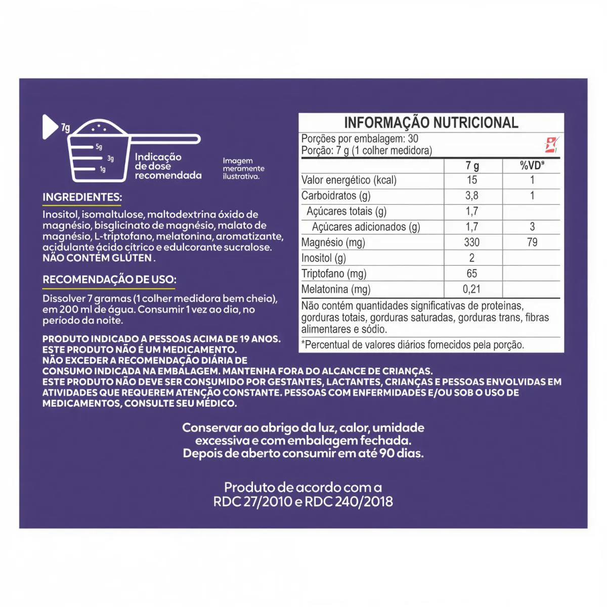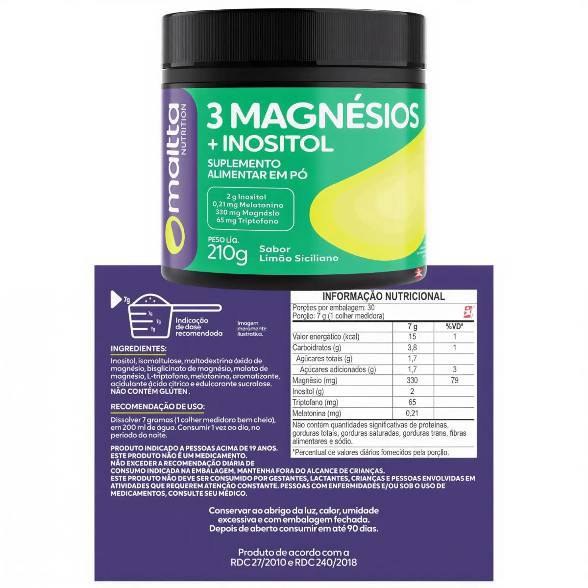 3 MAGNÉSIOS(ÓXIDO + BISGLICINATO + MALAT0) + INOSITOL + MELATONINA + triptofano 210G LIMÃO SICILIANO 30 DOSES - MALTTA NUTRITION DESCRIÇÃO 3 Magnésios Inositol é formulado para oferecer uma combinação sinérgica de três diferentes formas de magnésios, pois conta com o bisglicinato, óxido e malato de magnésio associados ao inositol, desta forma unindo os benefícios destes nutrientes. A combinação visa não apenas contribuir com a necessidade de magnésio, mas também auxiliar no bem-estar geral. O magnésio auxilia no funcionamento muscular e neuromuscular, no metabolismo energético, de proteínas, carboidratos e gorduras. O magnésio auxilia na formação de ossos e dentes. BENEFÍCIOS - Cada frasco fornece/rende 30 doses/porções – 1 mês; - 2g de Inositol por porção; - 330mg de Magnésio por porção; - 65mg de Triptofano por porção; - 021mg de Melatonina por porção - 3 Formas de Magnésio - Óxido de Magnésio + Bisglicinato de Magnésio + Malato de Magnésio; - Alto teor de Magnésio; - Inositol; - Pode auxiliar no bem-estar geral; - Metabolismo energético de proteínas, carboidratos e gorduras; - Auxilia na formação de ossos e dentes; - Selo eureciclo. SUGESTÃO DE USO Dissolver 7 gramas (1 colher medidora bem cheia), em 200 ml de água. Consumir 1 vez ao dia, no período da noite. TABELA NUTRICIONAL - COMPOSIÇÃO - RECOMENDAÇÕES & CONSERVAÇÃO Anexo nas imagens do anúncio. DADOS TÉCNICOS Registro ANVISA – Produto de acordo com a RDC 27/2010 e RDC 240/2018. Marca – Duom: MALTTA NUTRITION. Conteúdo líquido total – 210 g. Rendimento líquido total – 30 doses/porções. Peso líquido total – 210g. Peso bruto total – 270g. Peso produto + embalagem (aproximado) – 400g. Código de barras (EAN) – 7898665753002. Dimensões do produto – largura 9,5cm; altura 9,5cm; comprimento 9,5cm. Dimensões da embalagem padrão – largura 12 cm; altura 11cm; comprimento 16cm. ITENS DO ANÚNCIO - 1 Unidade do produto: 3 MAGNÉSIOS(ÓXIDO + BISGLICINATO + MALAT0) + INOSITOL + MELATONINA + TRIPTOFANO 210G LIMÃO SICILIANO 30 DOSES - MALTTA NUTRITION. Total – 210g POR POTE.