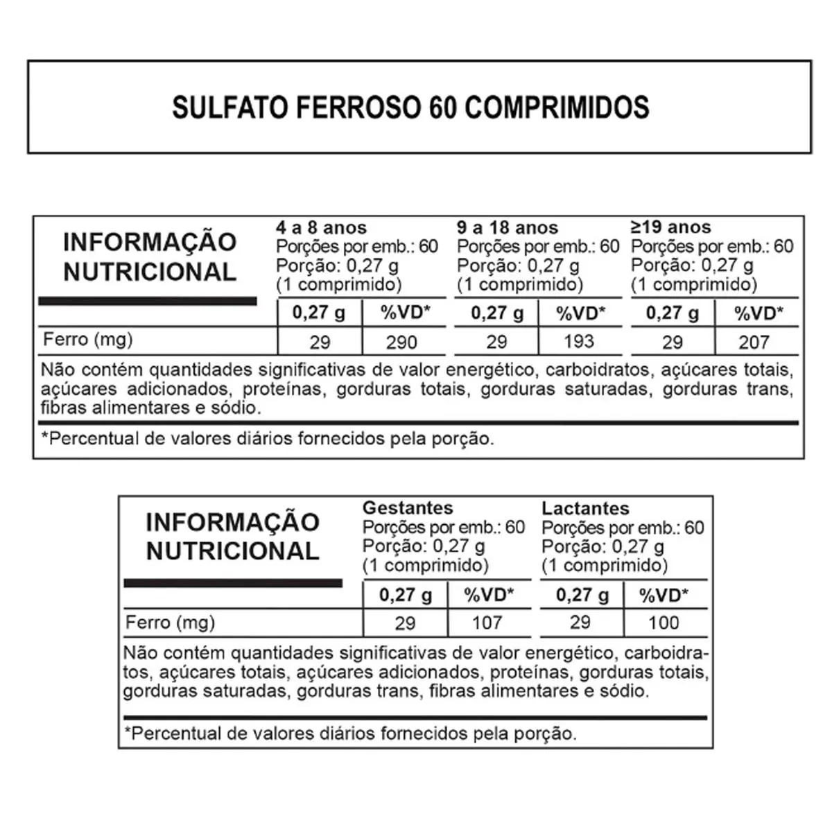 03 Unidades de Sulfato Ferroso na concentração de 29mg de ferro elementar por comprimido