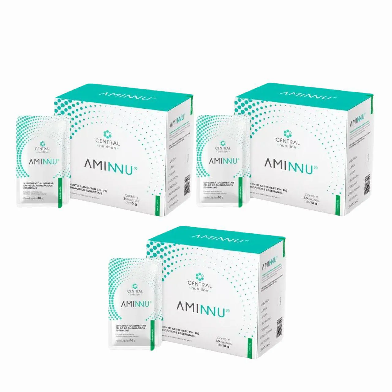 Aminnu 10g- 30 Sachês- Central Nutrition- Limão. Kit contendo 3 caixas com 30 sachês cada.