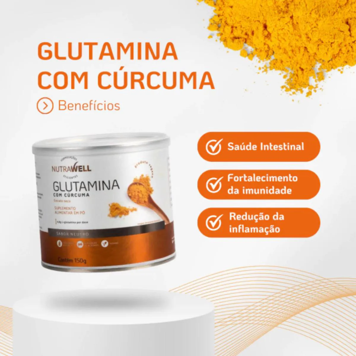 A glutamina com Cúrcuma da Nutrawell é um suplemento formulado por especialistas para pessoas que buscam fortalecer o sistema imunológico por meio da saúde intestinal. Seus ativos – L-glutamina e extrato seco de cúrcuma – agem como combustível das células do intestino, possuem potente ação antioxidante e anti-inflamatória, atuando em sinergia com todos os sistemas do corpo humano. Ingredientes: l-Glutamina, extrato de rizomas de cúrcuma longa (curcumina) e antiumectante dióxido de silício. Misture uma porção de 5g (1 scoop) em sua bebida preferida ou apenas na água. Consumir com líquidos frios.
