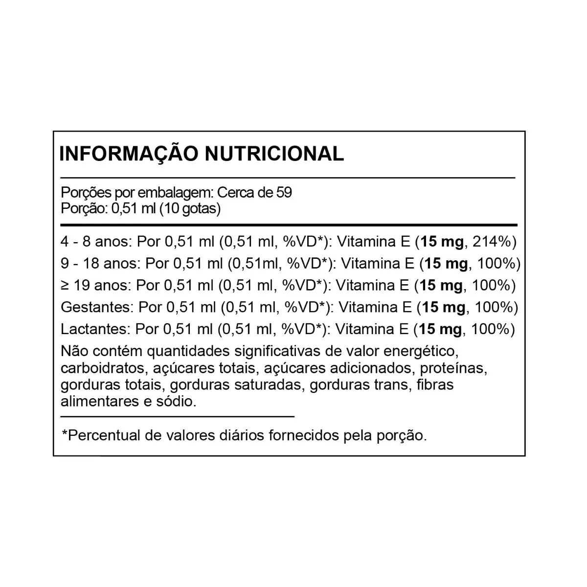 A vitamina e é um antioxidante que auxilia na proteção dos danos causados pelos radicais livres. Esta ação antioxidante está associada à diminuição do envelhecimento celular e danos ao material genético das células. A vitamina E é essencial para quem busca mais saúde, beleza e energia no dia a dia. Rica em ação antioxidante, ela combate os radicais livres e fortalece o sistema imunológico. Ingredientes: Mistura de tocoferóis, água, triglicerídeo de cadeia média, agente de massa glicerol e emulsificante lecitina. Alérgicos: CONTÉM DERIVADOS DE SOJA. NÃO CONTÉM GLÚTEN.