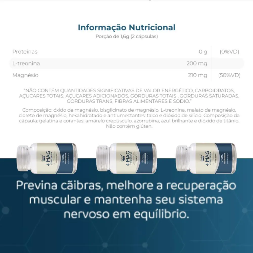 O magnésio + treonina são essenciais para a síntese de proteínas e o equilíbrio energético do corpo, promovendo bem-estar e vitalidade. Magnésio MAG 4 + TREONINA: A Combinação Perfeita para o Suporte Total ao Seu CorpoMagnésio MAG 4 + TREONINA da Elevelife é um suplemento que combina quatro formas diferentes de magnésio: malato de magnésio, bisglicinato de magnésio, óxido de magnésio aminoácido trionina e cloreto de magnésio. Cada forma foi selecionada para maximizar a absorção e garantir que seu corpo receba todos os benefícios essenciais que o magnésio pode oferecer. Este suplemento é ideal para quem busca otimizar a saúde muscular, nervosa, óssea e cardiovascular. Magnésio: Essencial para o Bem-Estar e Saúde do Corpo O magnésio é um mineral vital para diversas funções do corpo humano. Ele está envolvido em mais de 300 processos bioquímicos, como a regulação da função muscular, a transmissão nervosa e a produção de energia. Além disso, o magnésio é fundamental para a saúde óssea, cardiovascular e o equilíbrio de eletrólitos. Sua presença também auxilia na redução do estresse e na melhora da qualidade do sono, promovendo bem-estar e vitalidade. Garantir a ingestão adequada de magnésio é essencial para manter o corpo funcionando de maneira otimizada.