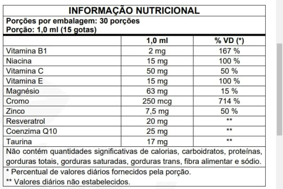 Kit com 4 unidades. SUPLEMENTO ALIMENTAR DE ÓLEO DE ABACATE, RESVERATROL, COENZIMA Q10, TAURINA, VITAMINAS E minerais EM GOTAS. Ingredientes: Óleo de abacate, magnésio dimalato, ascorbato de cálcio, bisglicinato de zinco, coenzima Q10, trans-resveratrol sintética, taurina, acetato de alfa-tocoferol, niacina, picolinato de cromo, tiamina. NÃO CONTÉM GLUTEN Recomendação de Uso: Ingerir 15 gotas ao dia. Conservação: CONSERVAR AO ABRIGO DA LUZ, CALOR E UMIDADE. CONSUMIR ESTE PRODUTO CONFORME A RECOMENDAÇÃO DE INGESTÃO DIÁRIA CONSTANTE NA EMBALAGEM. Advertência: MANTER FORA DO ALCANCE DAS CRIANÇAS. "ESTE PRODUTO NÃO DEVE SER CONSUMIDO POR GESTANTES, LACTANTES E CRIANÇAS"