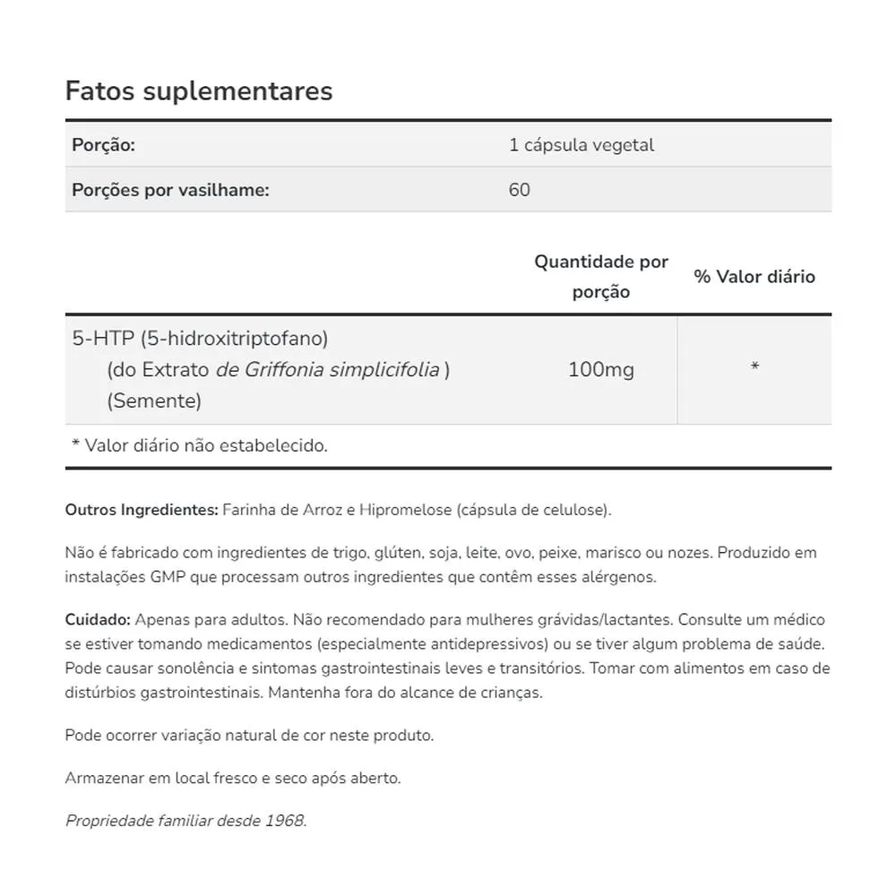5-Htp 100mg Now Foods 5-Hidroxitriptofano 120Veg Caps - No Brasil O Now Foods 5-HTP, em uma potência de 100mg, em embalagens com 120 cápsulas vegetarianas é um produto que foi cuidadosamente elaborado para fornecer uma dose balanceada deste importante nutriente; O 5-HTP, metabólito intermediário entre o aminoácido L-triptofano e a serotonina, é extraído da semente de uma planta africana ( Griffonia simplicifolia ). Outros Ingredientes: Hipromelose (cápsula de celulose). Fabricado sem ingredientes de trigo, glúten, soja, leite, ovo, peixe, marisco ou nozes. Apenas para adultos. Não recomendado para mulheres grávidas/lactantes. Variação de cor natural pode ocorrer neste produto. Conservar em local fresco e seco após a abertura. Tome 1 cápsula por dia, de preferência com o estômago vazio ao deitar; As cápsulas vegetarianas são fáceis de engolir e projetadas para serem rapidamente absorvidas. São livres de corantes, sabores e conservantes artificiais, assim você obtém apenas o que necessita; O 5-HTP é uma forma fácil e conveniente de garantir que você esteja recebendo os nutrientes necessários. É fácil de usar, basta seguir as instruções na embalagem. Recomenda-se a consulta com um profissional antes de iniciar qualquer programa de suplementação. VIDE VALIDADE