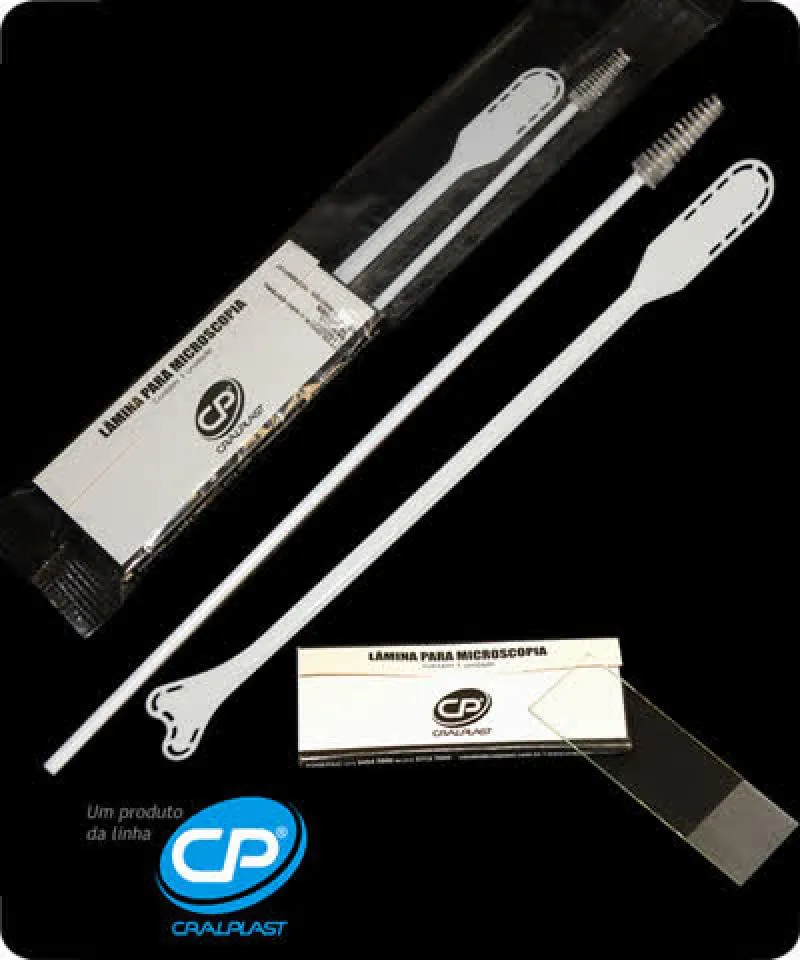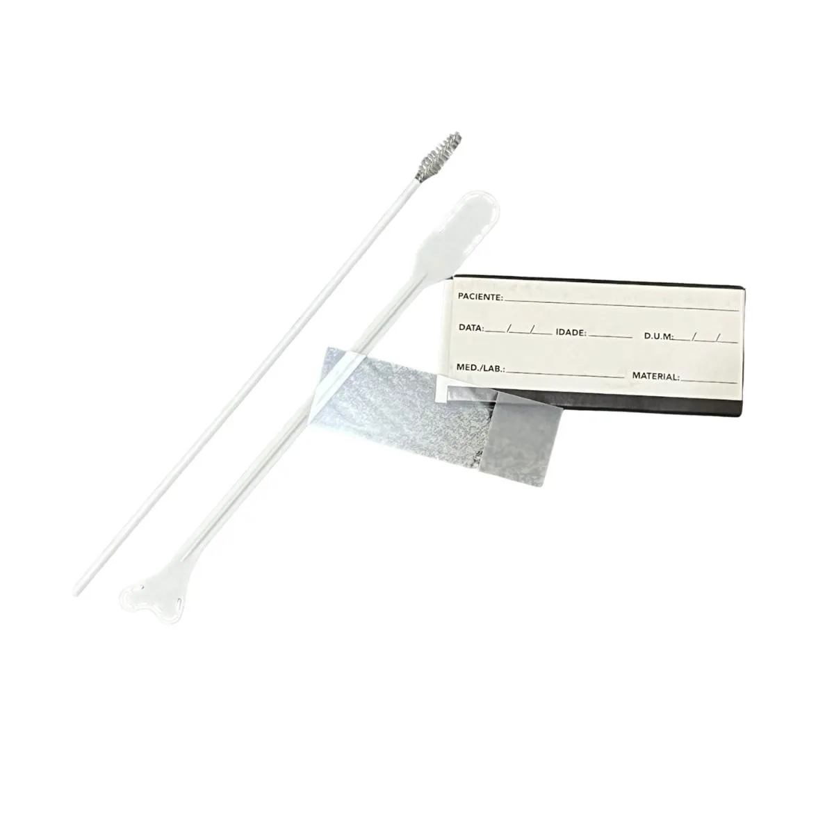 – 01 escova cervical + 01 espátula de Ayre (plástico ou madeira) + 01 porta-lâmina com 1 lâmina de vidro. Versões: