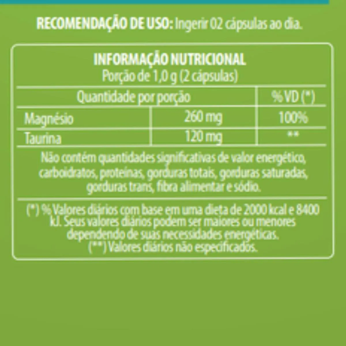 kit com 5x, RECOMENDAÇÃO DE USO: Ingerir 02 Cápsulas vegetais ao dia. INGREDIENTES: Bisglicinato de Magnésio, Taurato de Magnésio, Malato de Magnésio, Estearato de Magnésio (INS470iii), Dióxido de Silício (INS 551) COMPOSIÇÃO DA CÁPSULA: Hypromellose. NÃO CONTÉM GLÚTEN.