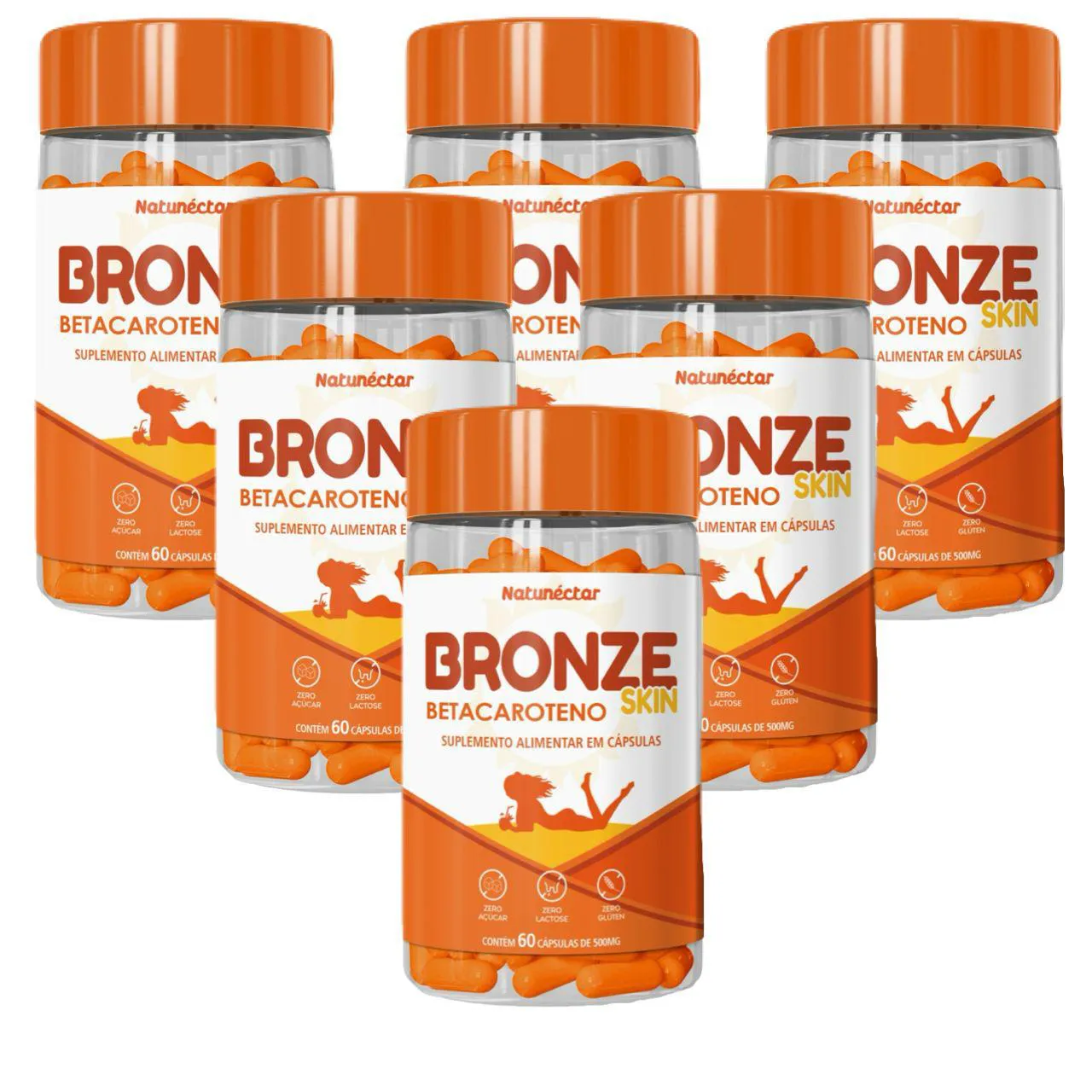 BRONZE SKIN - BETACAROTENO. Kit contendo 6 frascos com 60 cápsulas cada.