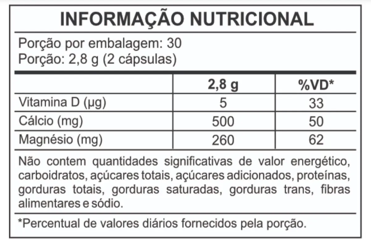 - Suporte à saúde óssea com combinação de cálcio, magnésio e vitamina D3.
