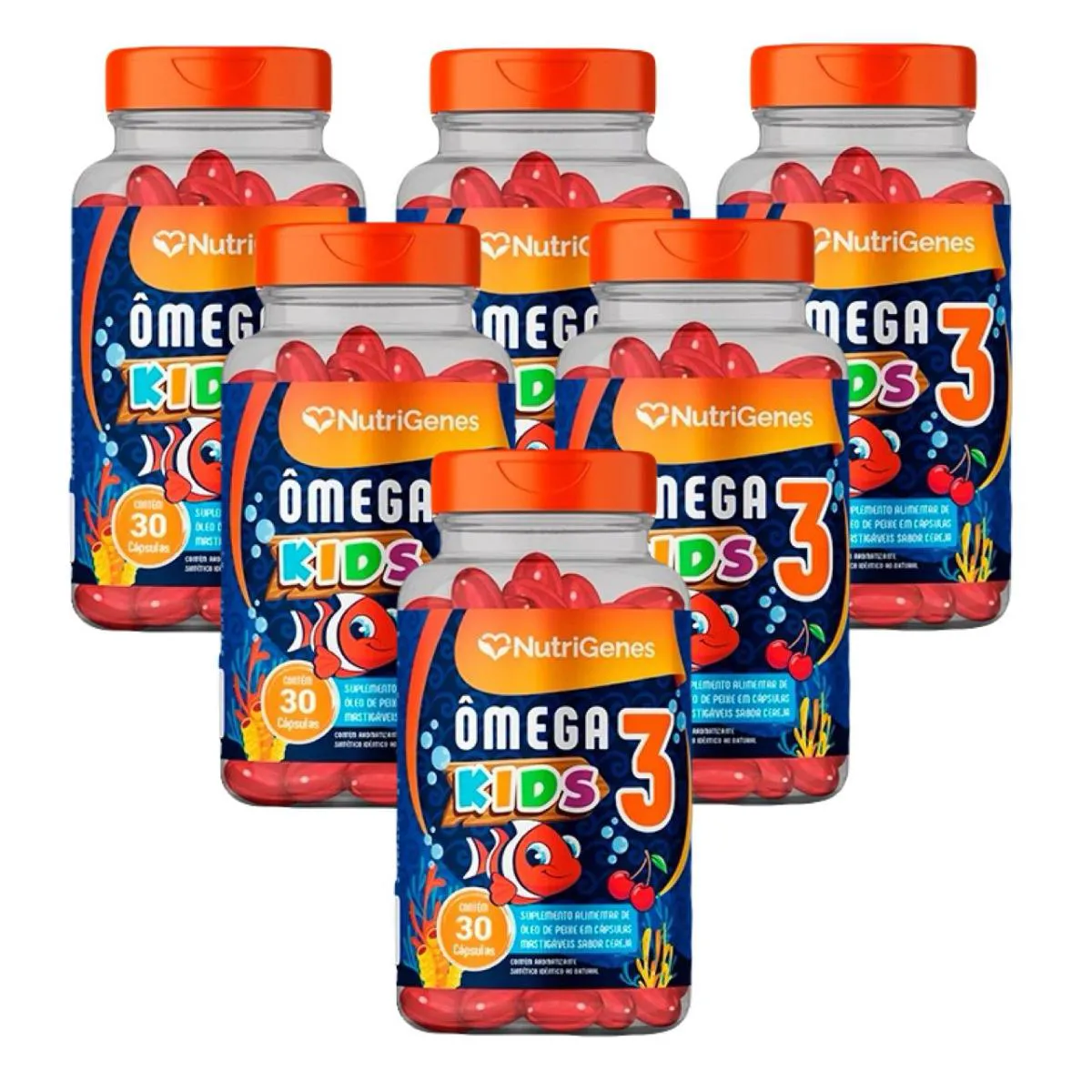 Ômega 3 Kids - 30 Caps. Mastigáveis - Nutrigenes - Sabor Cereja - Kit contendo 6 frascos com 30 cápsulas mastigáveis cada.