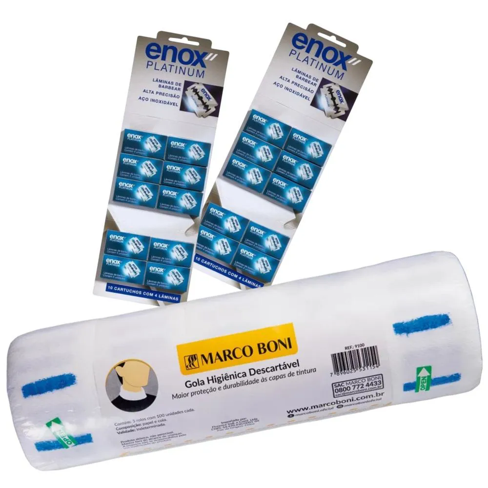 tornando o salão mais profissional e sofisticado. Contém 01 pacote com 5 rolos de gola higiênica descartável Cada rolo contém 100un de gola higiênica LÂMINA DE BARBEAR FIO DUPLO PLATINUM ENOX A Lâmina De Barbear Enox proporciona um corte ágil e preciso. Lâmina duplo fio em aço inoxidável e fio revestido de platina. Indicada para barbear, e finalização em cortes de cabelo. Contém 20 caixas de lâminas de barbear fio duplo platinum