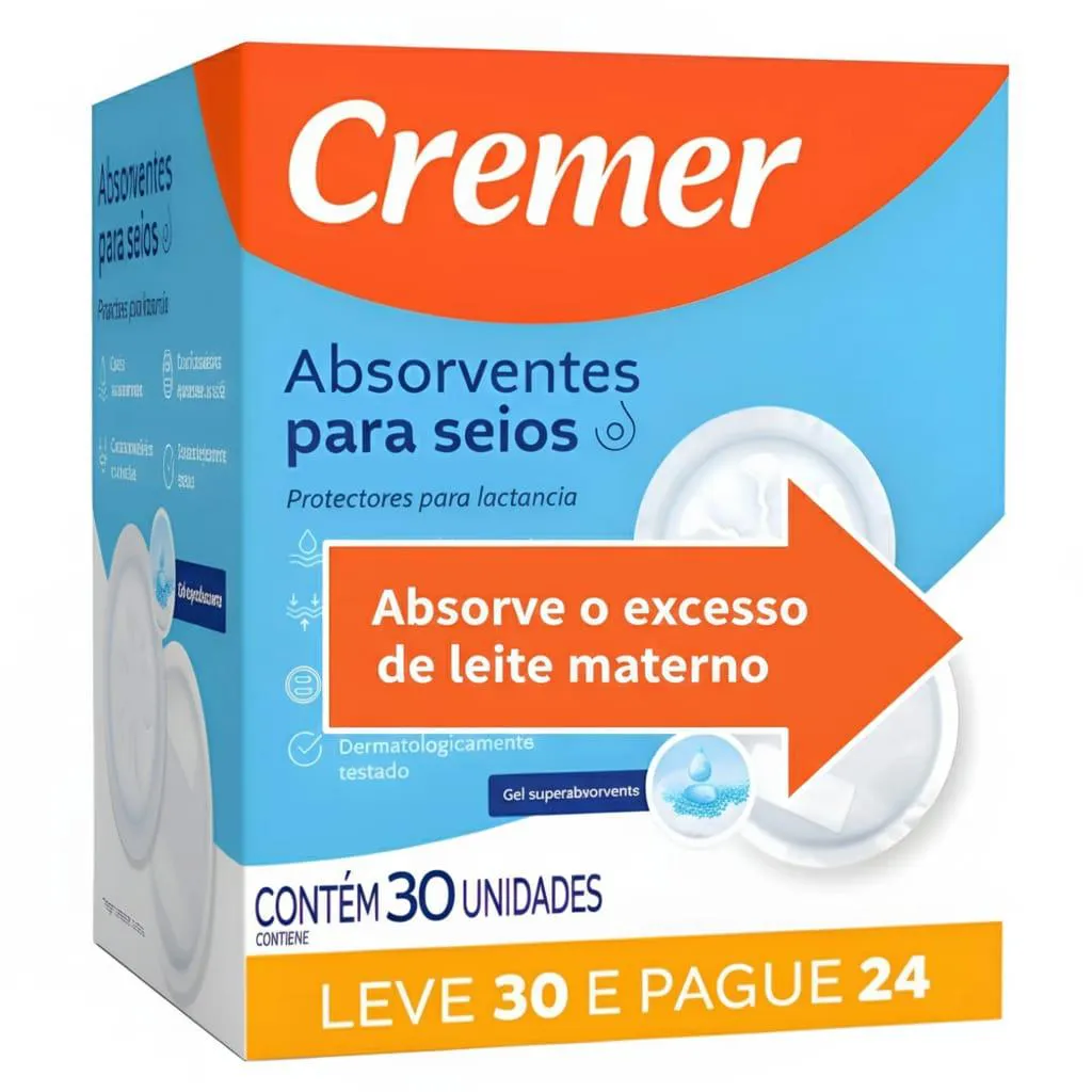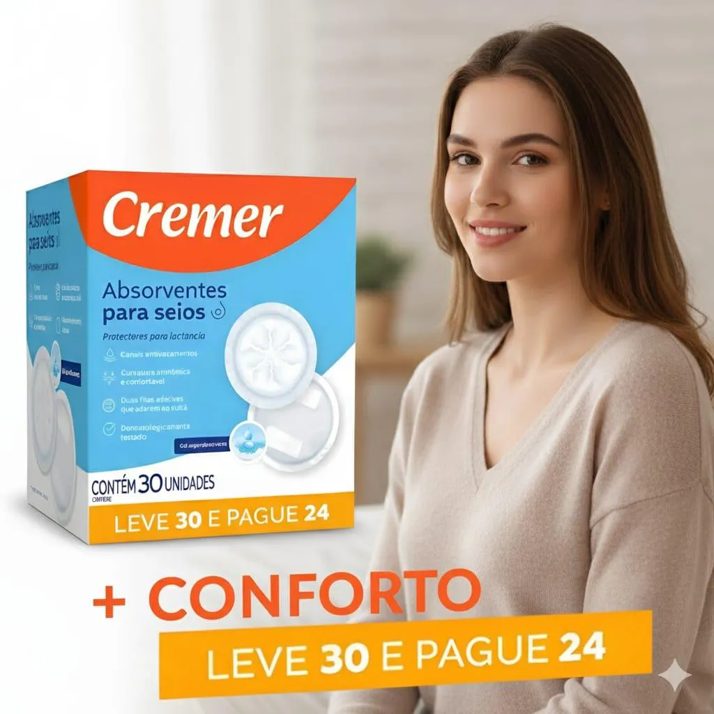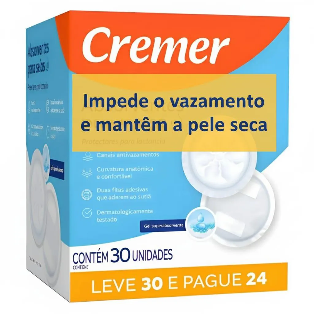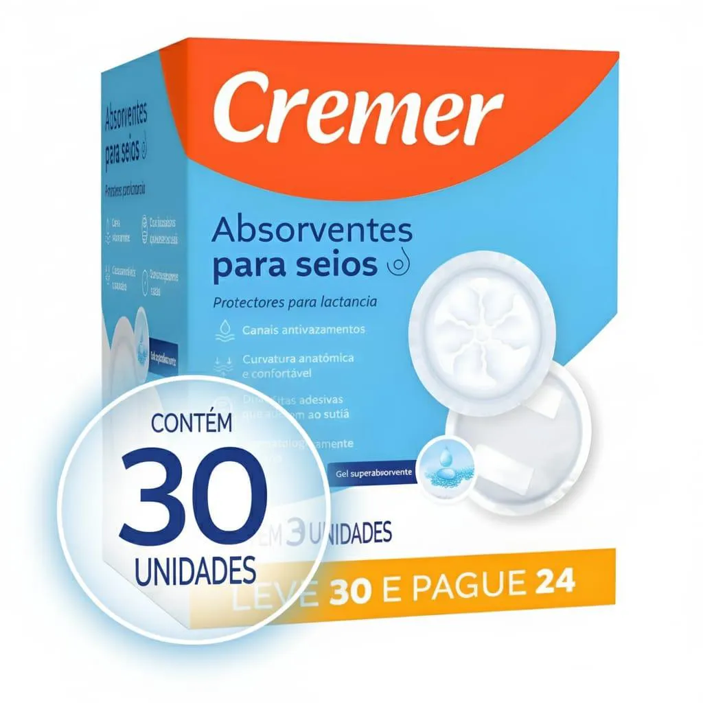 absorvente PARA SEIOS CREMER 30 UNIDADES Você merece conforto em todos os momentos. Apresentamos o absorvente para seios Cremer com 12 unidades. Com formato anatômico e super absorvente , ele oferece: Segurança contra vazamentos: mantenha a pele e roupas secas; Conforto invisivel: Discreto, fino e macio, não marca na roupa; Adesivo fixador: Permanece no lugar, mesmo em movimento; Caracteristicas: Canais Antivazamentos; Curvatura Anatômica e confortável; Duas fitas adesivas que aderem ao sutiã; Dermatologicamente testado; Gel Superabsorvente; Ideal para você sair com o seu bebê para onde quiser, sem se preocupar com vazamento de leite e incomodos na sua roupa