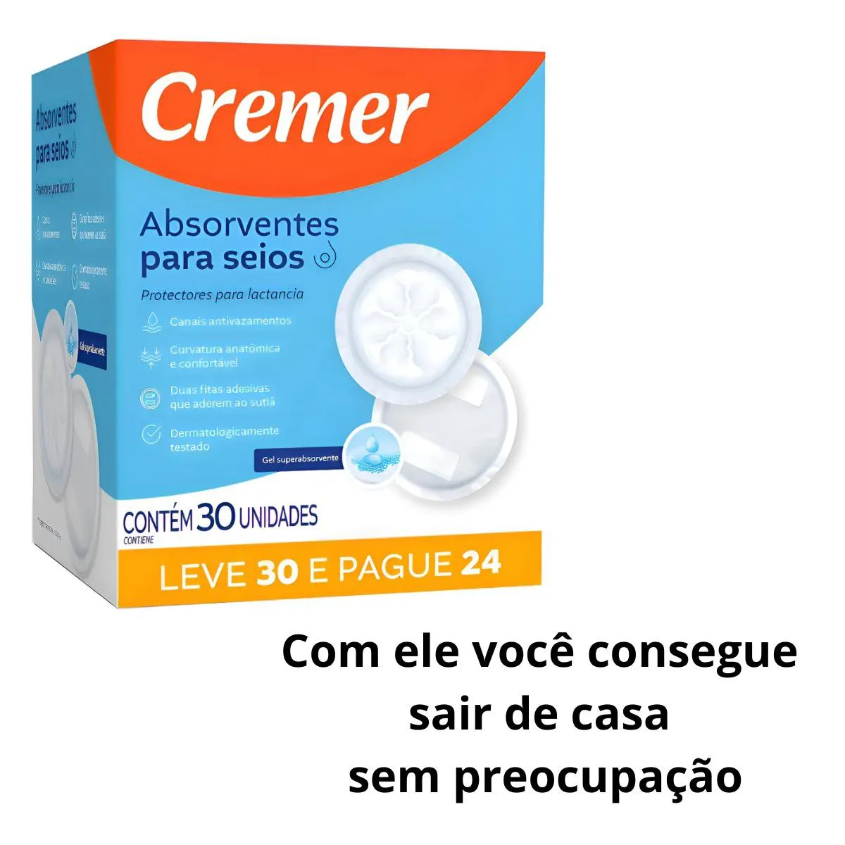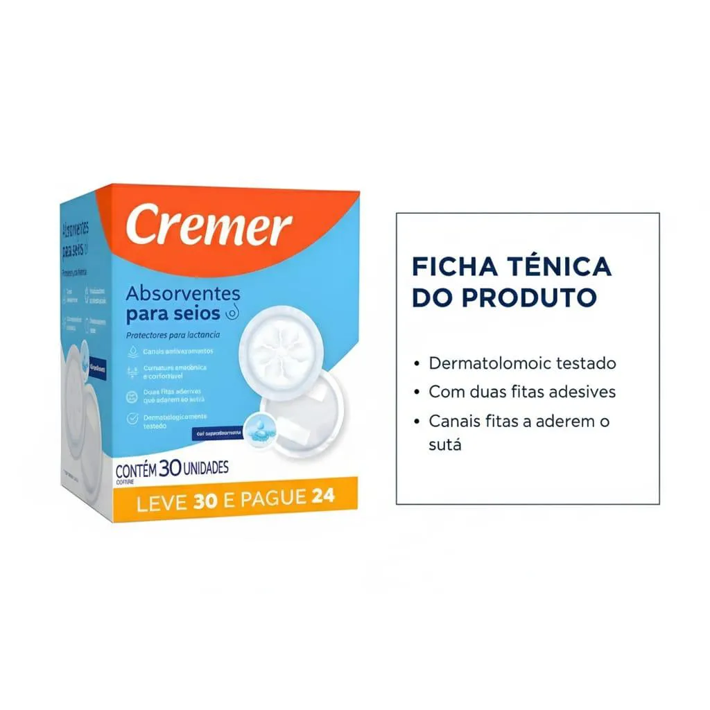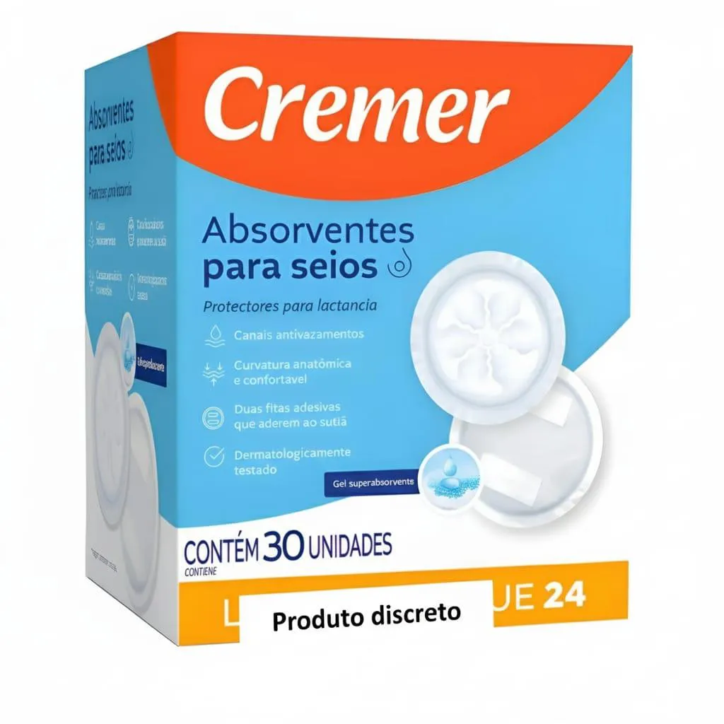 absorvente PARA SEIOS CREMER 30 UNIDADES Você merece conforto em todos os momentos. Apresentamos o absorvente para seios Cremer com 12 unidades. Com formato anatômico e super absorvente , ele oferece: Segurança contra vazamentos: mantenha a pele e roupas secas; Conforto invisivel: Discreto, fino e macio, não marca na roupa; Adesivo fixador: Permanece no lugar, mesmo em movimento; Caracteristicas: Canais Antivazamentos; Curvatura Anatômica e confortável; Duas fitas adesivas que aderem ao sutiã; Dermatologicamente testado; Gel Superabsorvente; Ideal para você sair com o seu bebê para onde quiser, sem se preocupar com vazamento de leite e incomodos na sua roupa