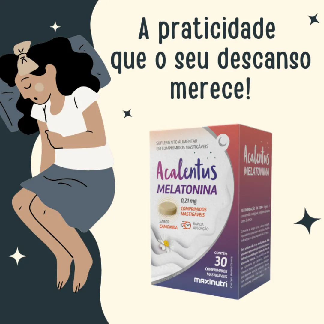 Acalentus Melatonina é um suplemento alimentar em comprimidos mastigáveis, com sabor de camomila, ajuda a regular o sono, atuando no ciclo circadiano, promovendo relaxamento e garantindo uma sensação de conforto ainda melhor na hora de dormir.