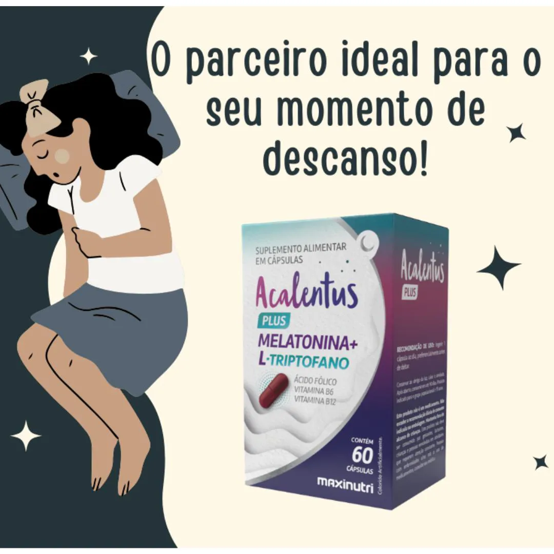 Acalentus Plus Melatonina + L-triptofano atua para melhorar a qualidade do sono, pois combina a melatonina, hormônio do sono, com o triptofano, que é precursor da serotonina e melatonina. Ele também ajuda a promover relaxamento, aliviar o estresse e a ansiedade, e regular o humor. Principais funções do Acalentus Plus: Regulação do sono: A melatonina ajuda a regular o ciclo circadiano, sinalizando ao cérebro que é hora de dormir, enquanto o triptofano auxilia na produção natural de melatonina pelo organismo; Relaxamento e bem-estar: A combinação dos ativos promove um estado de relaxamento, ajudando a acalmar a mente e o corpo; Melhora do humor: O triptofano é um precursor da serotonina, neurotransmissor essencial para a regulação do humor, o que pode contribuir para uma sensação de bem-estar e calma; Alívio da ansiedade: Ao aumentar os níveis de serotonina, o suplemento pode ajudar a reduzir os sintomas de ansiedade. Outros benefícios: O suplemento também é enriquecido com magnésio, ácido fólico e vitaminas B6 e B12, que auxiliam no metabolismo energético, formação de células, e função muscular. Recomendações e advertências: - Este produto é um suplemento alimentar e não deve ser usado como substituto de uma dieta equilibrada; - O uso é contraindicado para gestantes, lactantes, crianças e pessoas que realizam atividades que exigem atenção constante; - É fundamental consultar um médico ou nutricionista antes de iniciar o uso, especialmente se você tiver alguma condição de saúde ou estiver tomando medicamentos. - Leia atentamente as instruções e a dosagem recomendada na embalagem.