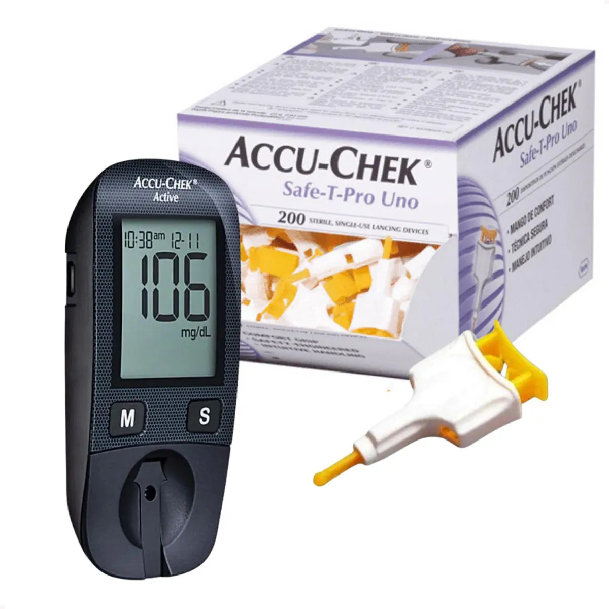 Kit Glicosímetro - Accu-Chek Active Medidor de Glicemia (Sem Lancetas, Sem Lançador, Sem Tiras, Apenas Aparelho) + Lancetas Accu-Chek Safe-T-Pro Uno com 200 Unidades - Roche
