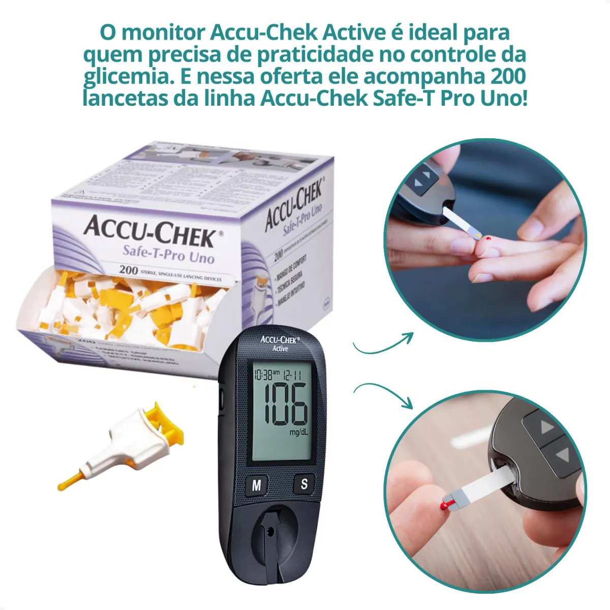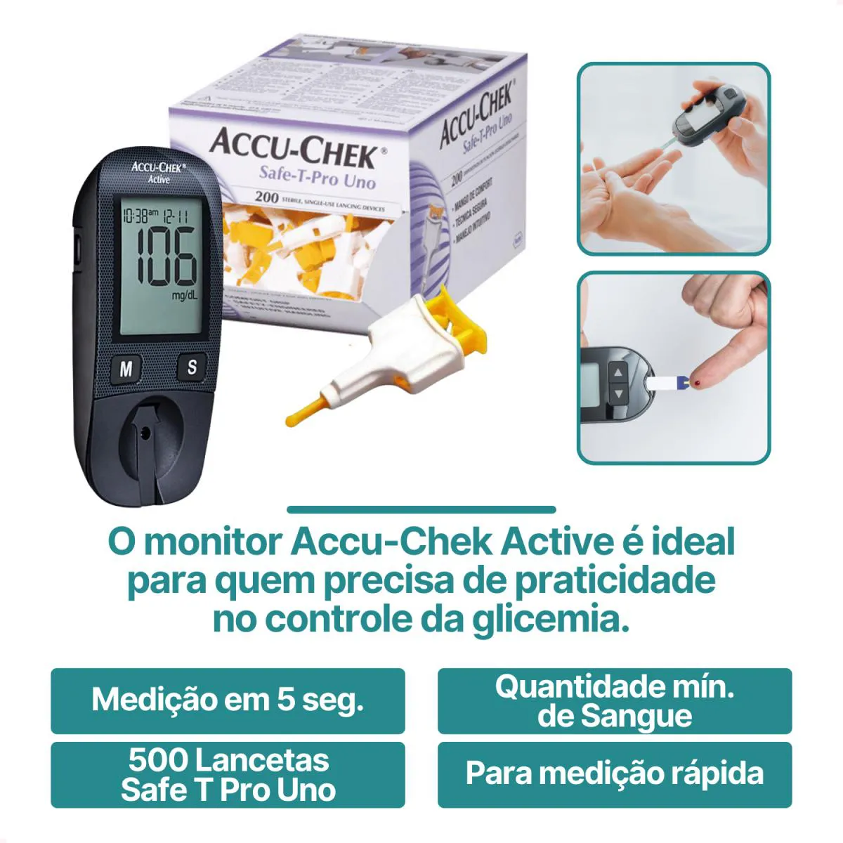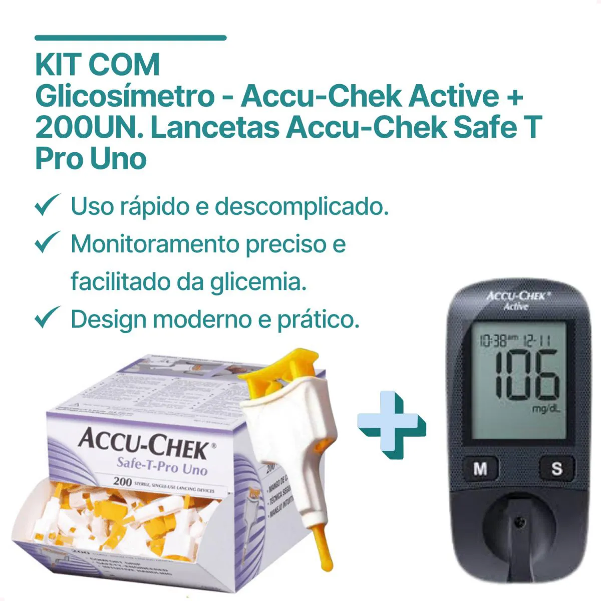 Este kit é composto pelo monitor Accu-Chek Active, que facilita o controle da glicemia, e as lancetas Accu-Chek Safe-T-Pro Uno, projetadas para coleta segura e prática de sangue. Ideal para o uso clínico e hospitalar, esse kit garante precisão, conforto e segurança no processo de monitoramento glicêmico.