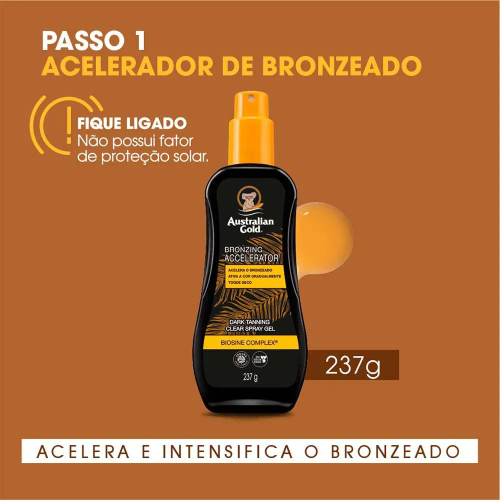 O acelerador de bronzeado é um produto cosmético desenvolvido com uma mistura de óleo de melaleuca, vitamina E e Aloe Vera, que contém o Biosine Complex®, uma combinação de ingredientes premium. Ele é formulado para preparar a pele para o bronzeamento, proporcionando uma coloração gradual e natural.