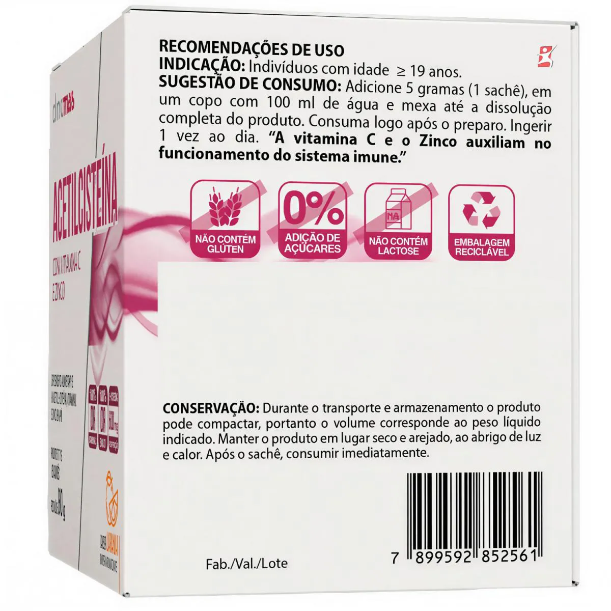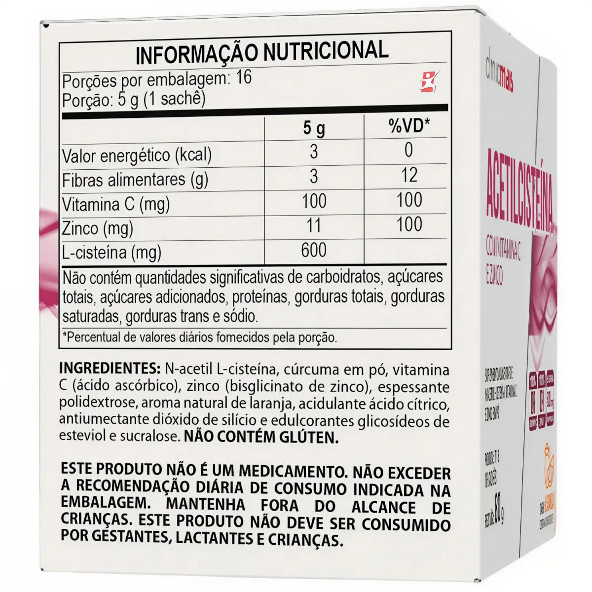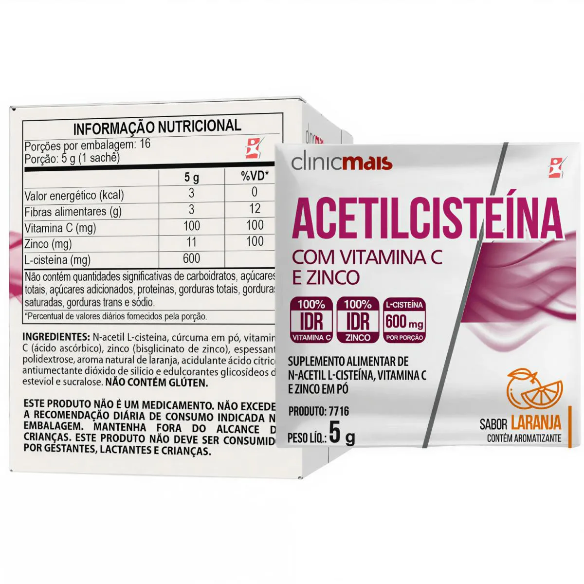 A Acetilcisteína ClinicMais combina N-Acetil L-Cisteína, vitamina C e Zinco em sachês de fácil dissolução e sabor laranja. Sua fórmula auxilia no funcionamento do sistema imunológico, na proteção contra o estresse oxidativo e no suporte à saúde respiratória. Com potente ação antioxidante, contribui para o equilíbrio do organismo e a eliminação de toxinas.A Acetilcisteína é um suplemento alimentar em pó, formulado com N-Acetil L-Cisteína, vitamina c e Zinco, três nutrientes amplamente estudados por seu papel na saúde do organismo. Apresentado em sachês individuais de 5g, com sabor laranja, o produto se dissolve facilmente em água, proporcionando praticidade e eficácia na suplementação diária. BENEFÍCIOS