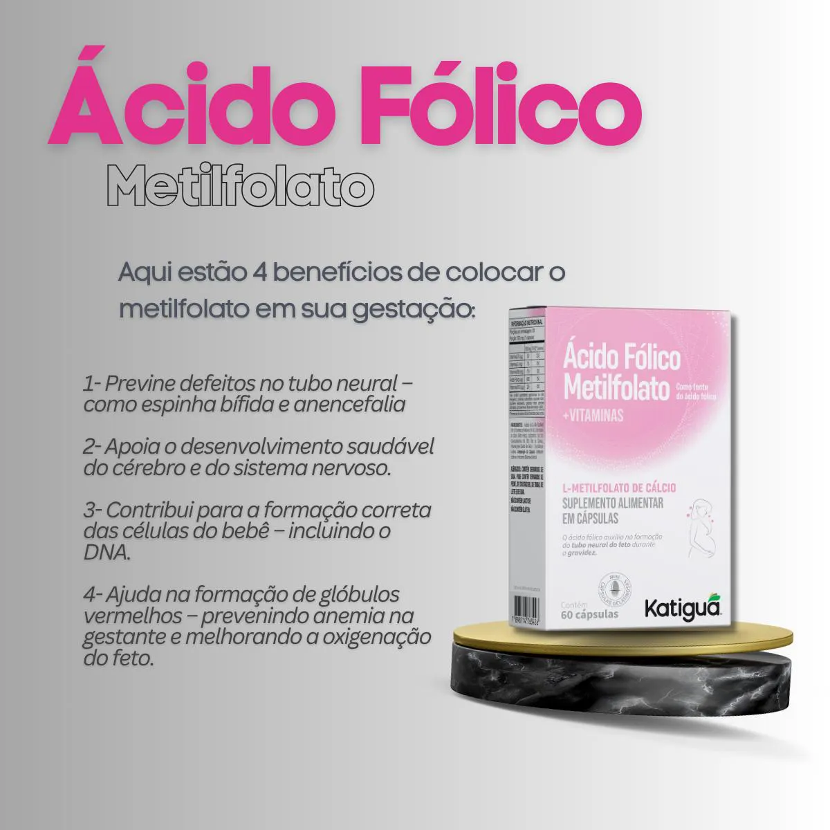 É um suplemento alimentar composto por ácido fólico, metilfolato e vitaminas essenciais, desenvolvido em cápsulas vegetais. Serve para apoiar a formação celular, contribuir para a produção de células sanguíneas, auxiliar no metabolismo energético e oferecer suporte nutricional específico para mulheres em idade fértil.