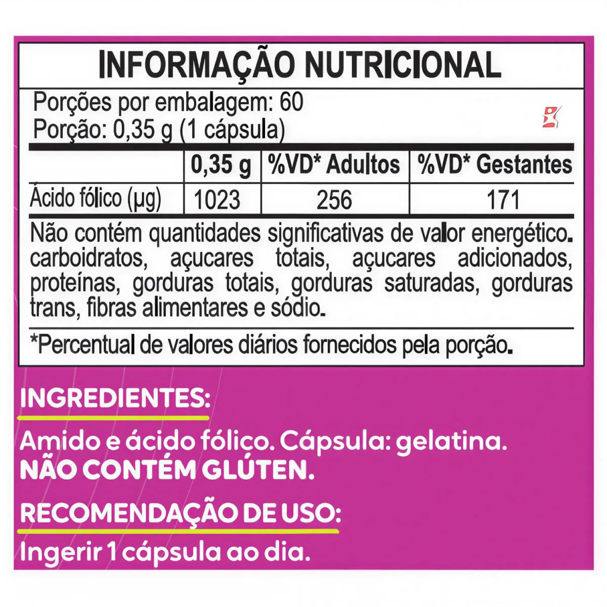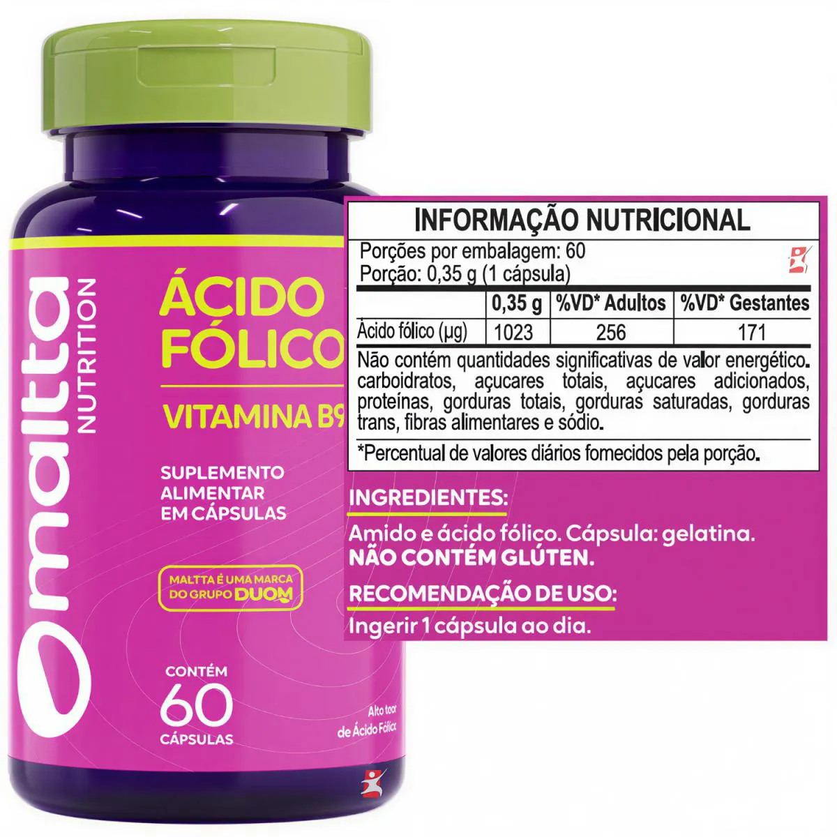 ÁCIDO FÓLICO vitamina B9 ALTO TEOR 1 AO DIA 60 CÁPSULAS - DUOM: MALTTA NUTRITION DESCRIÇÃO O ácido fólico é uma vitamina hidrossolúvel do complexo B, muito conhecida como B9. O ácido fólico auxilia na formação do tubo neural do feto durante a gravidez. Auxilia no funcionamento do sistema imune e na formação das células vermelhas do sangue. Ele tem participação em várias funções do organismo, contribuindo para a saúde cardiovascular e para o bom funcionamento do sistema nervoso e auxilia na síntese de aminoácidos. BENEFÍCIOS - Apenas 1 cápsula ao dia; - Cada frasco fornece/rende 60 doses/porções; - Auxilia na Gestação; - Fotoproteção; - Auxilia na prevenção e tratamento da queda capilar; - Auxilia no funcionamento do sistema imune; - Auxilia na síntese de aminoácidos; - Auxilia no processo de divisão celular. SINERGIA DE VITAMINAS & minerais A associação do ácido fólico com a vitamina c, é muito indicada. Ela irá favorecer a absorção do ácido fólico junto ao organismo. Outra excelente combinação, é a do ácido fólico + vitamina B12. A vitamina B12 vai potencializar a absorção e trabalhar em conjunto com o ácido fólico. SUGESTÃO DE USO Ingerir 1 cápsula ao dia. Preferencialmente 30 minutos antes do almoço, para melhor absorção e ação. TABELA NUTRICIONAL & COMPOSIÇÃO Em anexo nas imagens. RECOMENDAÇÕES & CUIDADOS Ácido Fólico (Vitamina B9). SUPLEMENTO ALIMENTAR EM CÁPSULAS. Contém 60 cápsulas. ALTO TEOR DE ÁCIDO FÓLICO. PRODUTO INDICADO A PESSOAS ACIMA DE 19 ANOS. ESTE PRODUTO NÃO É UM MEDICAMENTO. NÃO EXCEDER A RECOMENDAÇÃO DIÁRIA DE CONSUMO INDICADA NA EMBALAGEM. MANTENHA FORA DO ALCANCE DE CRIANÇAS. DADOS TÉCNICOS Marca – Duom: MALTTA NUTRITION Conteúdo líquido por frasco – 60 cápsulas. Rendimento por frasco – 60 doses/porções. Peso líquido por frasco – 27g. Peso bruto por frasco – 75g. Peso aproximado produto + embalagem - 300g. Código de barras (EAN) – 7898665750063. Registro ANVISA – Dispensado de registro de acordo com a resolução da RDC 27/2010 e RDC 240/2018 da ANVISA. Dimensões do produto – largura: 6 cm; altura: 10 cm; comprimento: 6 cm. Dimensões da embalagem/pacote - largura: 13 cm; altura: 7 cm; comprimento: 16 cm. ITENS DO ANÚNCIO - 1 Unidades do produto: ÁCIDO FÓLICO VITAMINA B9 ALTO TEOR 1 AO DIA 60 CÁPSULAS - DUOM: MALTTA NUTRITION Total – 60 cápsulas POR FRASCO.