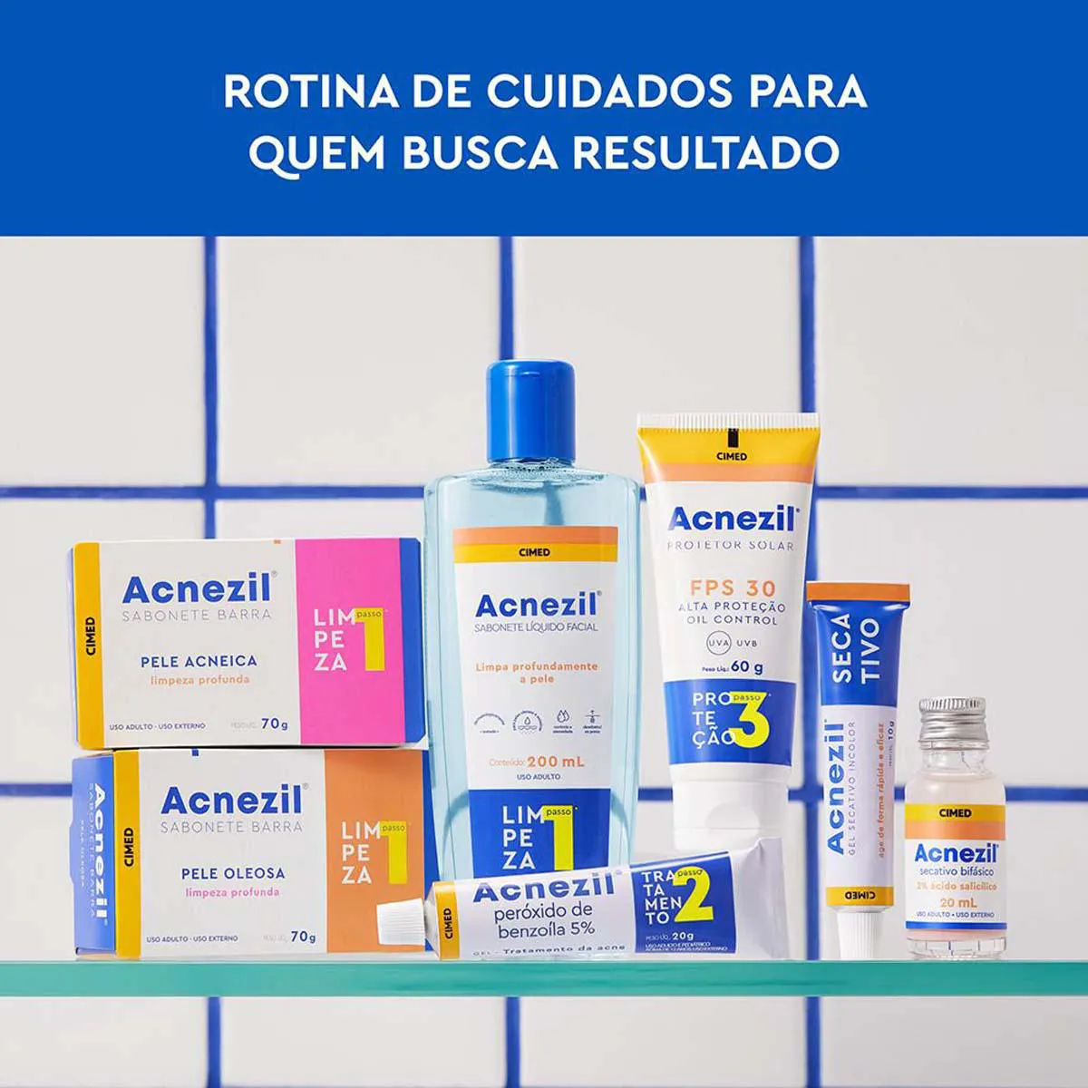 Acnezil Gel é um tratamento tópico da acne, que possui Peróxido de Benzoíla 5% com ação anti-inflamatória contra acne e controla a oleosidade da pele.