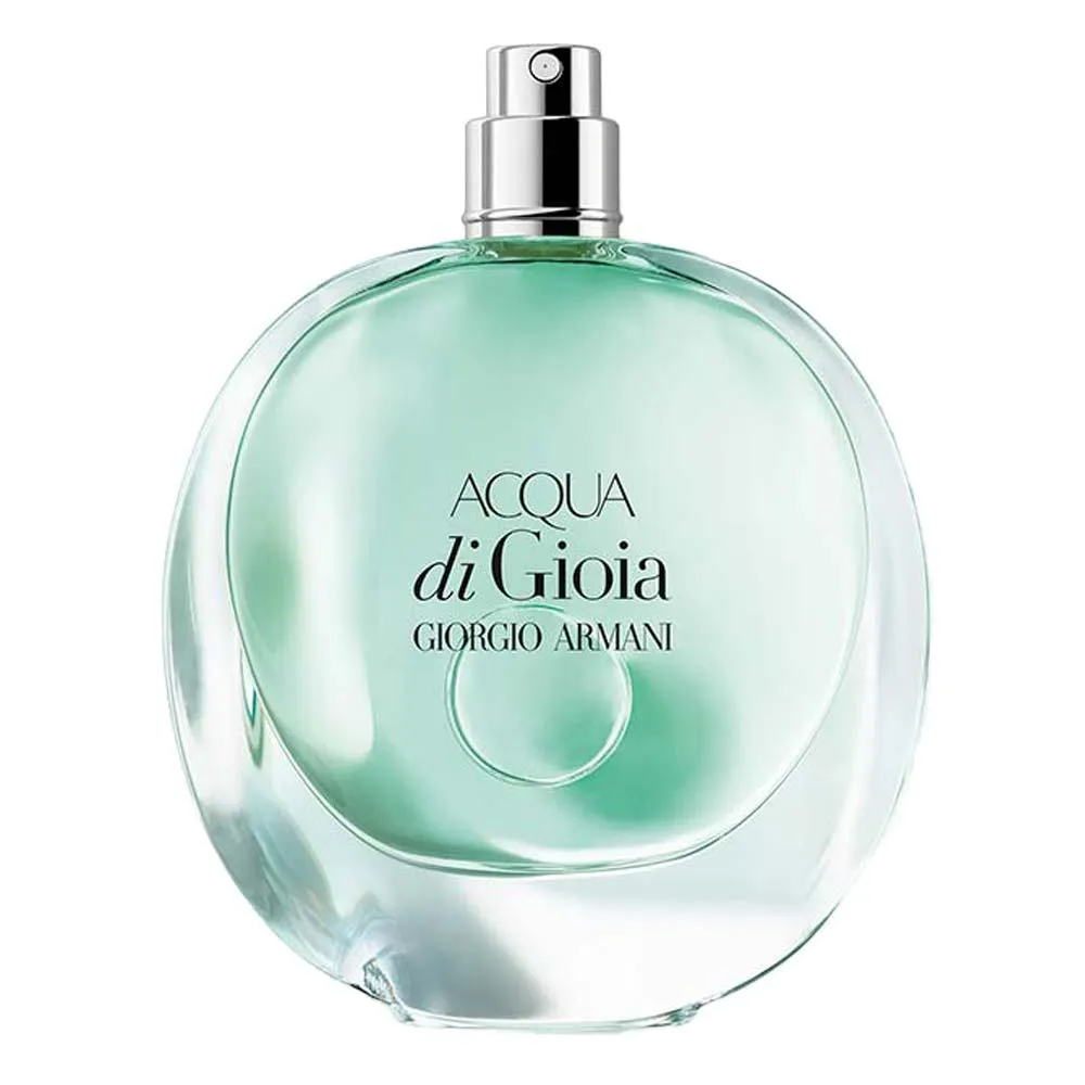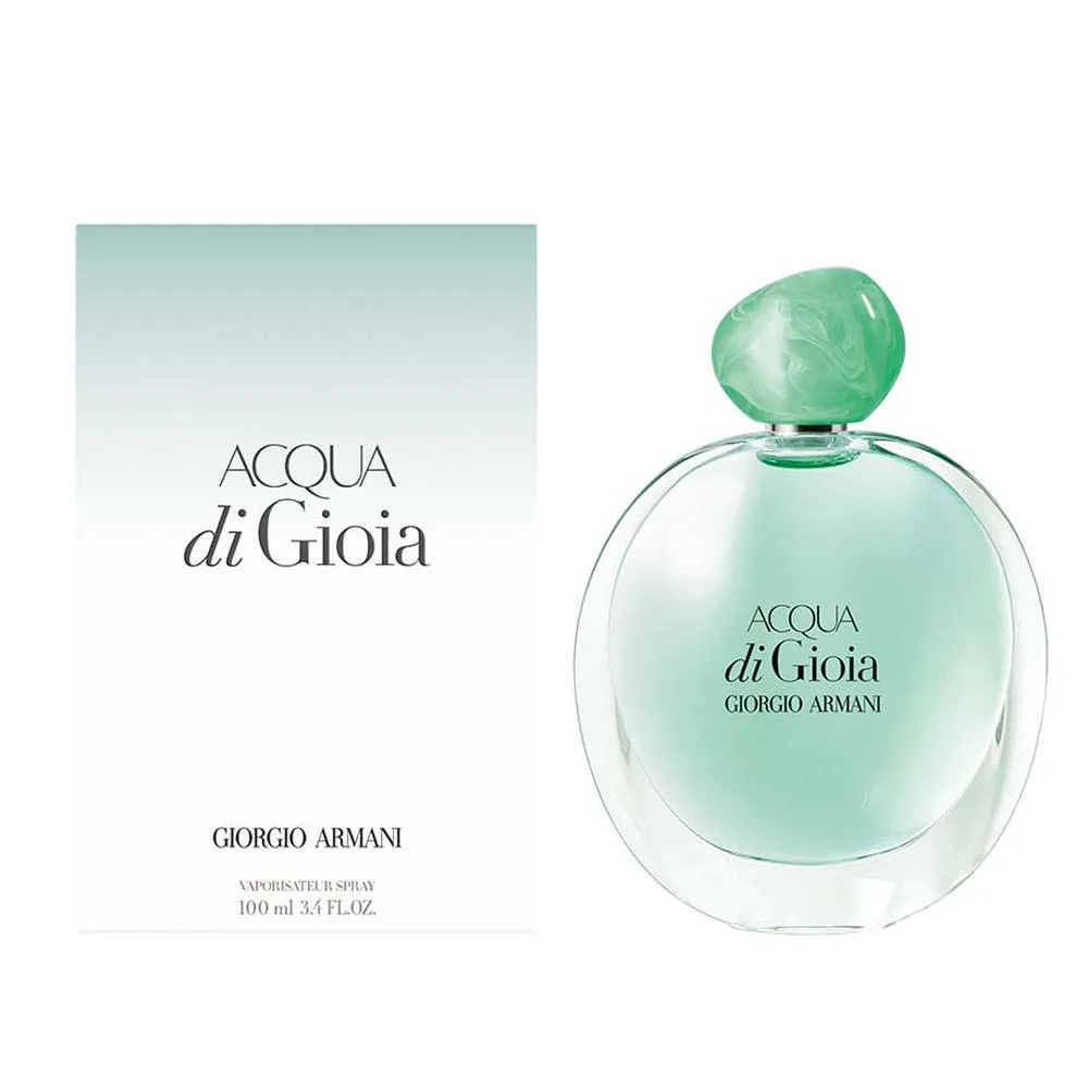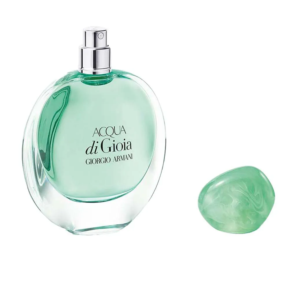 Com suas linhas curvas, inspiradas pelas formas da natureza, Giorgio Armanicriou o frasco do perfume feminina Acqua Di Gioia que combinando a idéia das ondas do mar e do corpo de uma mulher em uma única gora de vidro espesso e transparente. Sua embalagem minimalista na cor verde água é coberta por uma camada perolada que sugere o espírito natural e efervescente da fragrância.