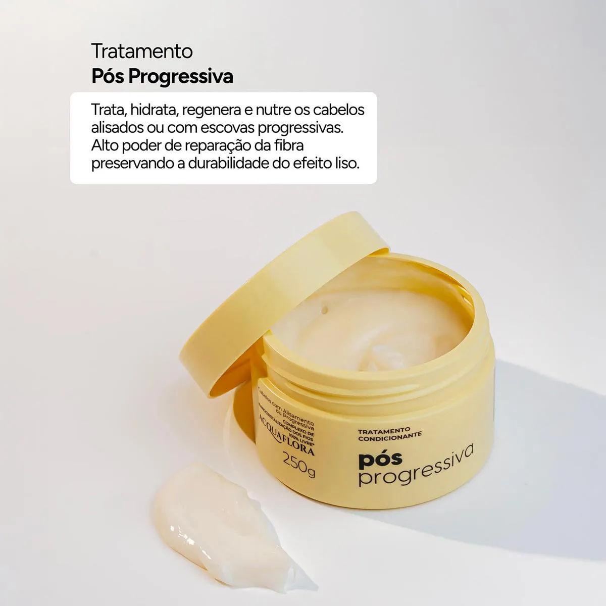 máscara para cabelos quimicamente alisados. Acquaflora Pós-Progressiva ajuda a nutrir, hidratar e regenerar profundamente os fios que passaram por processos de alisamento ou escovas progressivas.