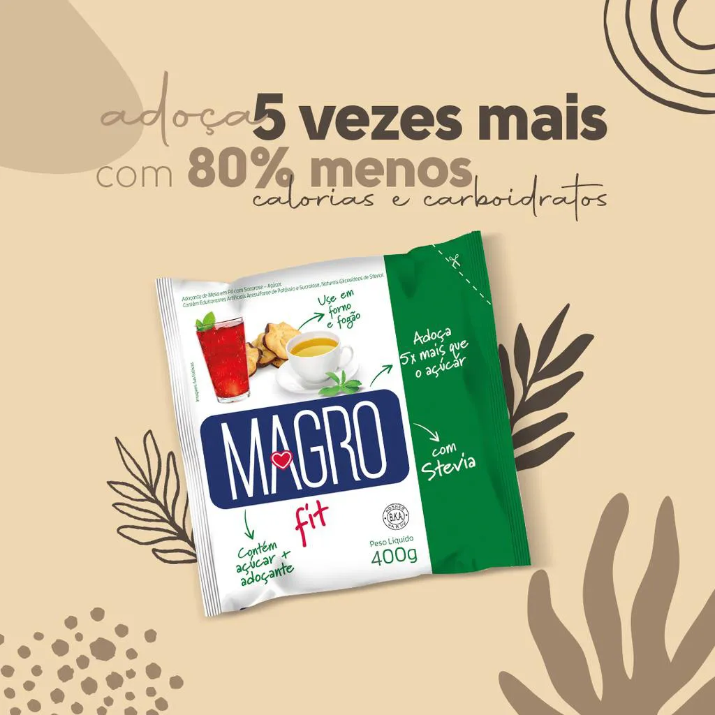 O Magro Fit com Stévia 400g é a perfeita combinação do sabor do açúcar com as calorias do adoçante. Ideal para quem busca uma alimentação mais saudável, mas não abre mão do sabor.
