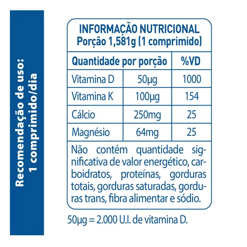 - Fórmula com Vitamina D, Cálcio, K2 e Magnésio.